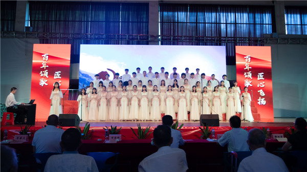 会上,学院师生带来了长笛合奏《百年再启航》、合唱《唱支山歌给党听》、舞蹈《战地山花别样红》、歌伴舞《灯火里的中国》精彩纷呈的节目。最后,全体参会人员齐唱《没有共产党就没有新中国》,用歌声共庆中国共产党成立100周年,大会在《国际歌》中圆满结束。