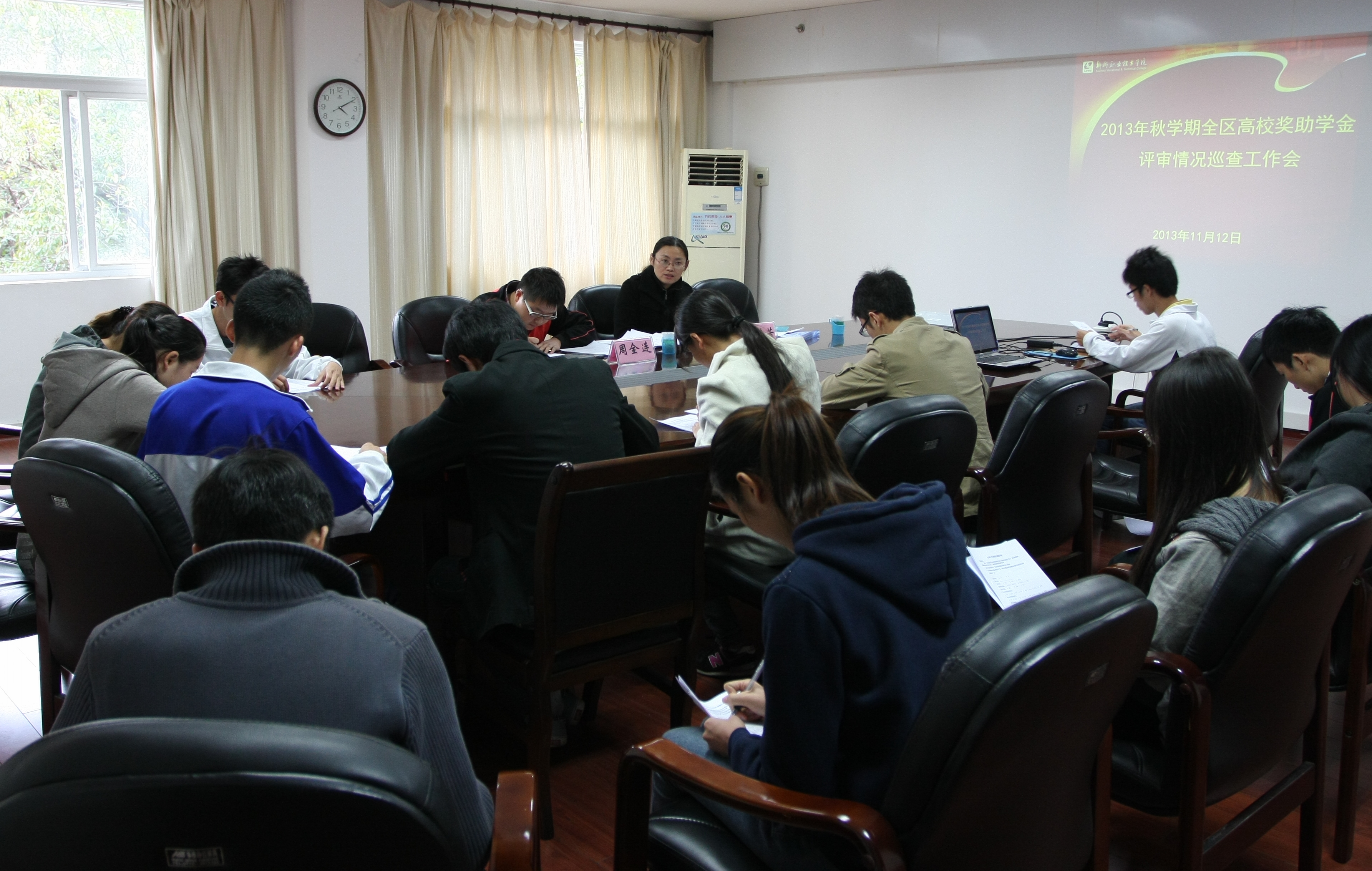 巡查工作会议于当日下午3点在我院行政楼303会议室进行,院学生资助办公室人员和部分系部资助专干参加了会议。会议由我院学生工作处处长唐冬雷主持,他代表学院对区资助办巡查组到我院检查指导工作表示欢迎,并就我院2013年秋学期开展奖助学金评审工作和近期我院的资助工作开展情况向巡查组成员作了简要汇报。接着,巡查组对我院2013年贫困生认定、奖助学金评审和助学金发放等材料进行抽查。同时召开获奖学生和未获资助学生的两个座谈会,并在学生中进行了《家庭经济困难学生资助工作调查问卷》和《大学生价值观的调查问卷》两个问卷调查。之后,巡查组就听取汇报、材料抽查、座谈会及问卷调查情况与我院到会资助工作人员进行了交流。