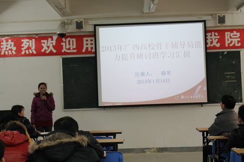 骆琴老师汇报了参加2013年广西高校骨干辅导员能力提升培训班的学习收获,她从“一个规划、一个会议、一个意见、两大举措、多项激励”等多个方面列举了辅导员网络能力培养的重要性,结合自己去年参加区辅导员职业能力大赛的经验,就比赛项目和考核的重点内容作了详细分析,为今年参加比赛的辅导员提供了宝贵经验。