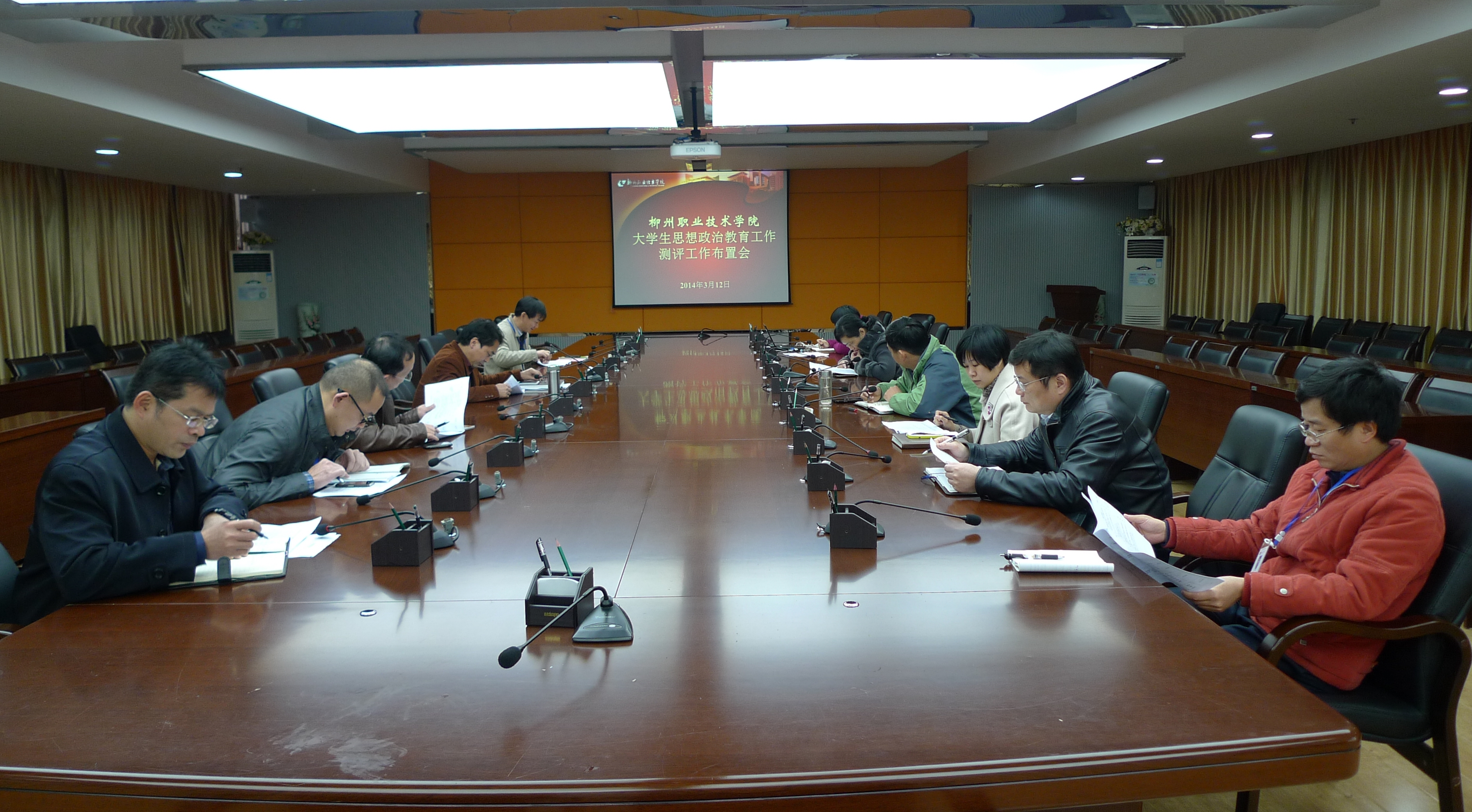 为了进一步贯彻落实《自治区党委宣传部、自治区高校工委关于开展<全国大学生思想政治教育工作测评体系(试行)>贯彻执行情况自测自评工作的通知》(桂党高工宣〔2014〕4号)精神,研讨和部署我院测评工作任务,2014年3月12日,我院在行政楼300会议室召开大学生思想政治教育工作测评推进会,学院党委副书记阳旭、各有关行政职能部门及思政部负责人参加了会议。会议由学生工作处处长唐冬雷主持。