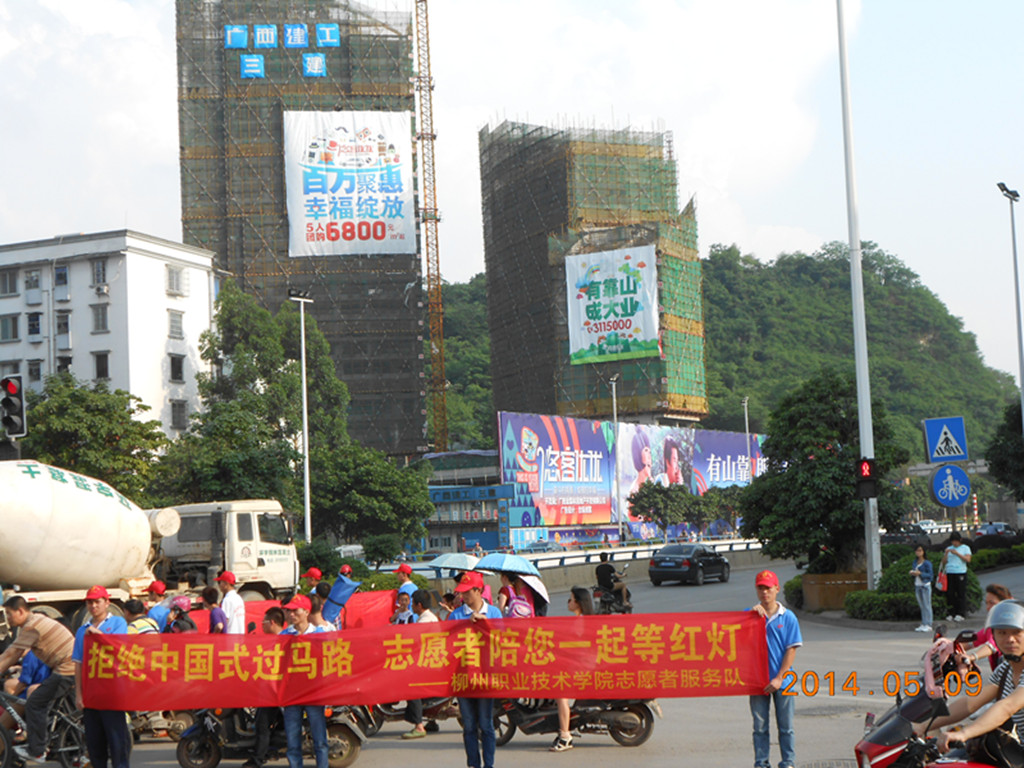 写有“拒绝中国式过马路,志愿者陪你一起等红灯”字样的鲜红横幅,出现在了柳州市东环大道与燎原路交叉路口,引起了人们的关注。这是我院青年志愿者为宣传交通安全反思日而举行的活动。