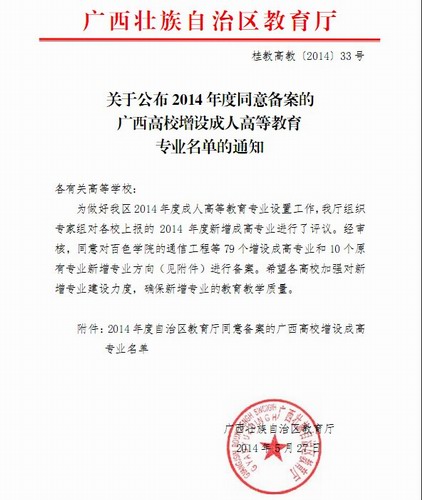 本次专业的成功申报,是我院根据教育厅《关于做好2014年度成人高等教育本专科新增专业申报与备案工作的通知》(桂教高教[2014]3号)要求,在相关部门领导的支持下,由继续教育中心精心组织骨干教师,分析区域经济社会发展需求及近年来相关行业毕业生就业需求状况,科学论证申报专业的必要性和可行性,并依据学院自身的办学条件和办学特色来规划和设置新专业的。