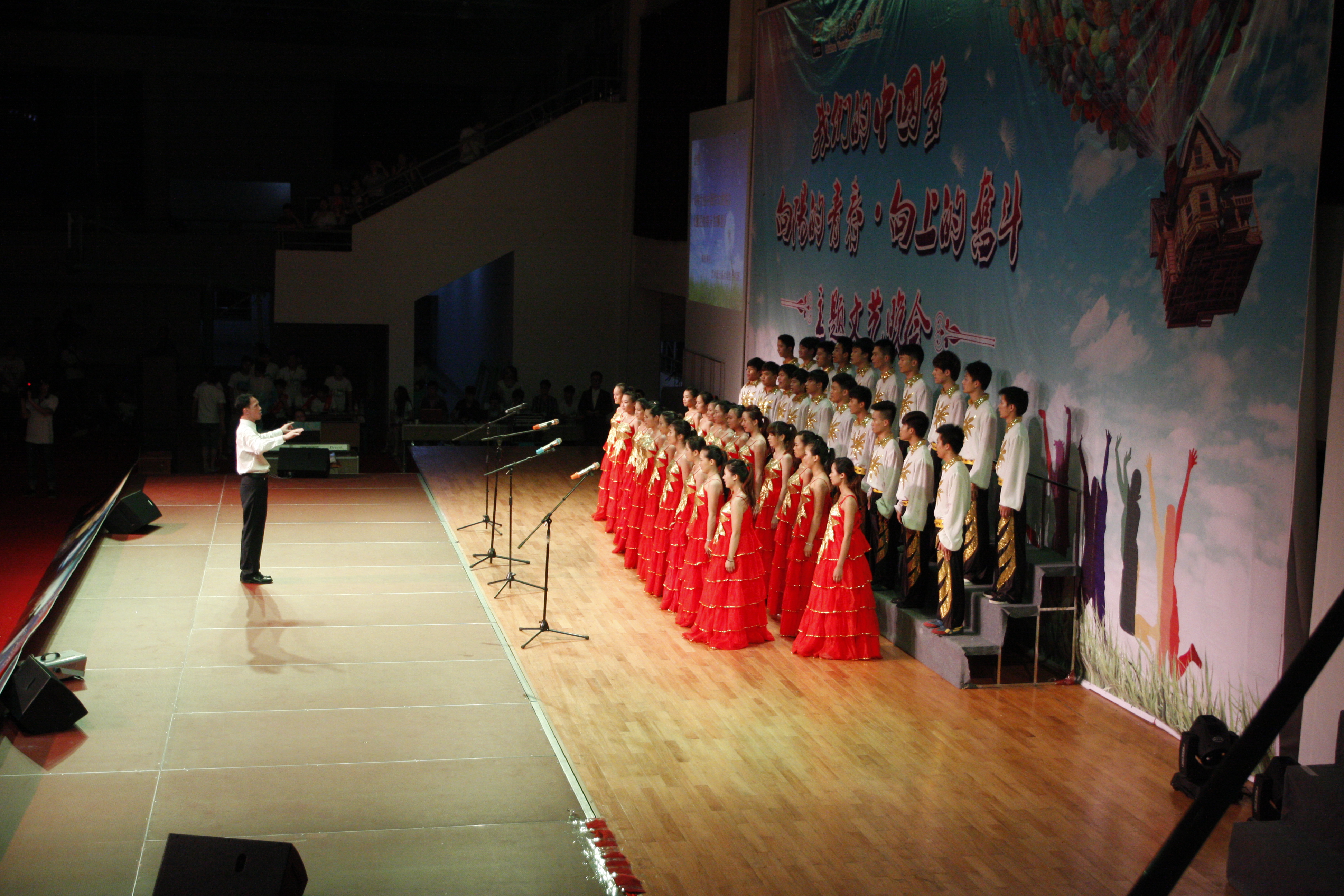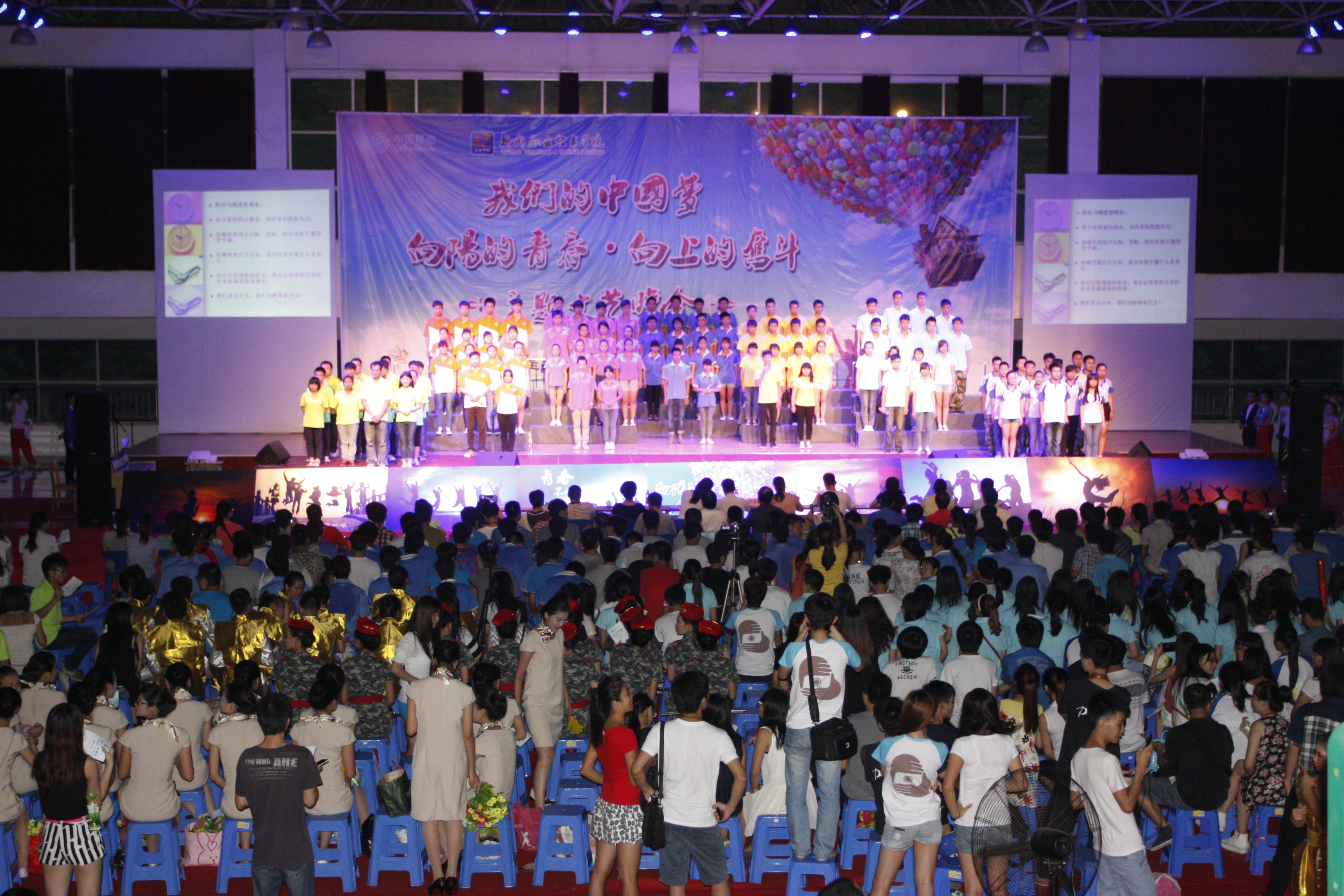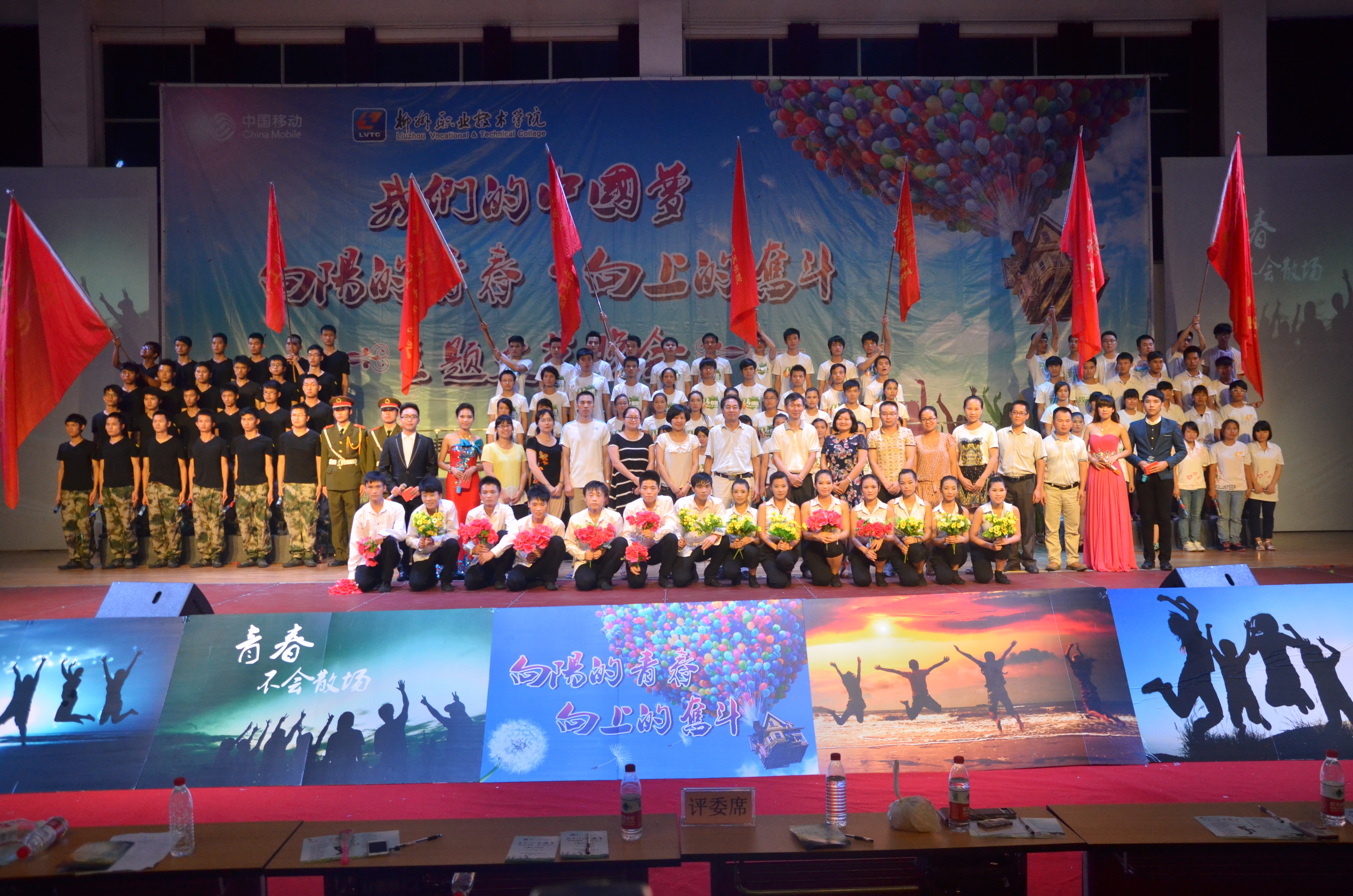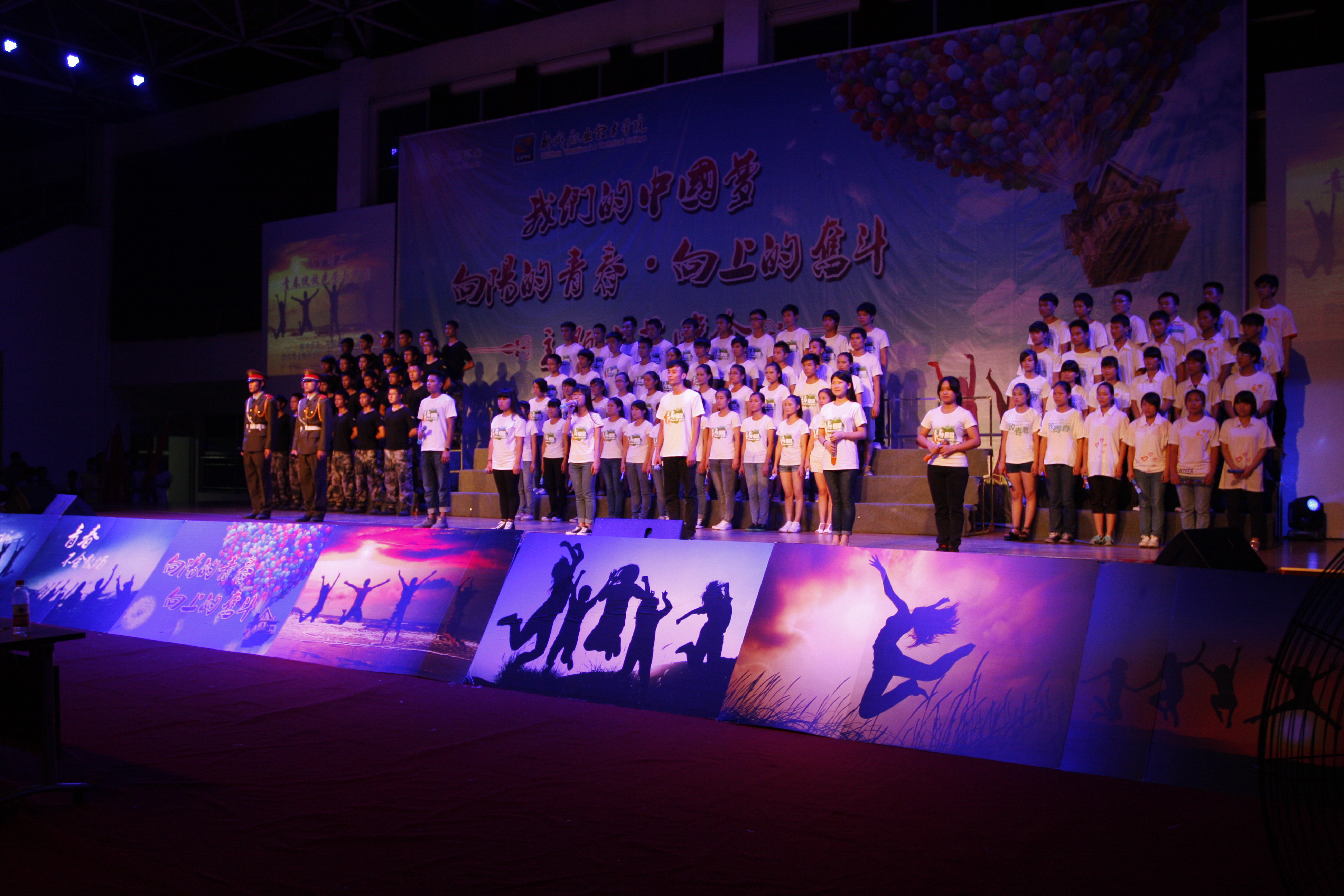 2014年6月20日晚,由院团委主办、院学生会承办的“我们的中国梦——向阳的青春•向上的奋斗”“五四”文艺晚会于体育馆四楼隆重举行。学院党委书记朱伟才、副书记阳旭以及学生工作处、各系部领导、学院青年教师代表等,与全院800多名学生代表一起观看了晚会。
