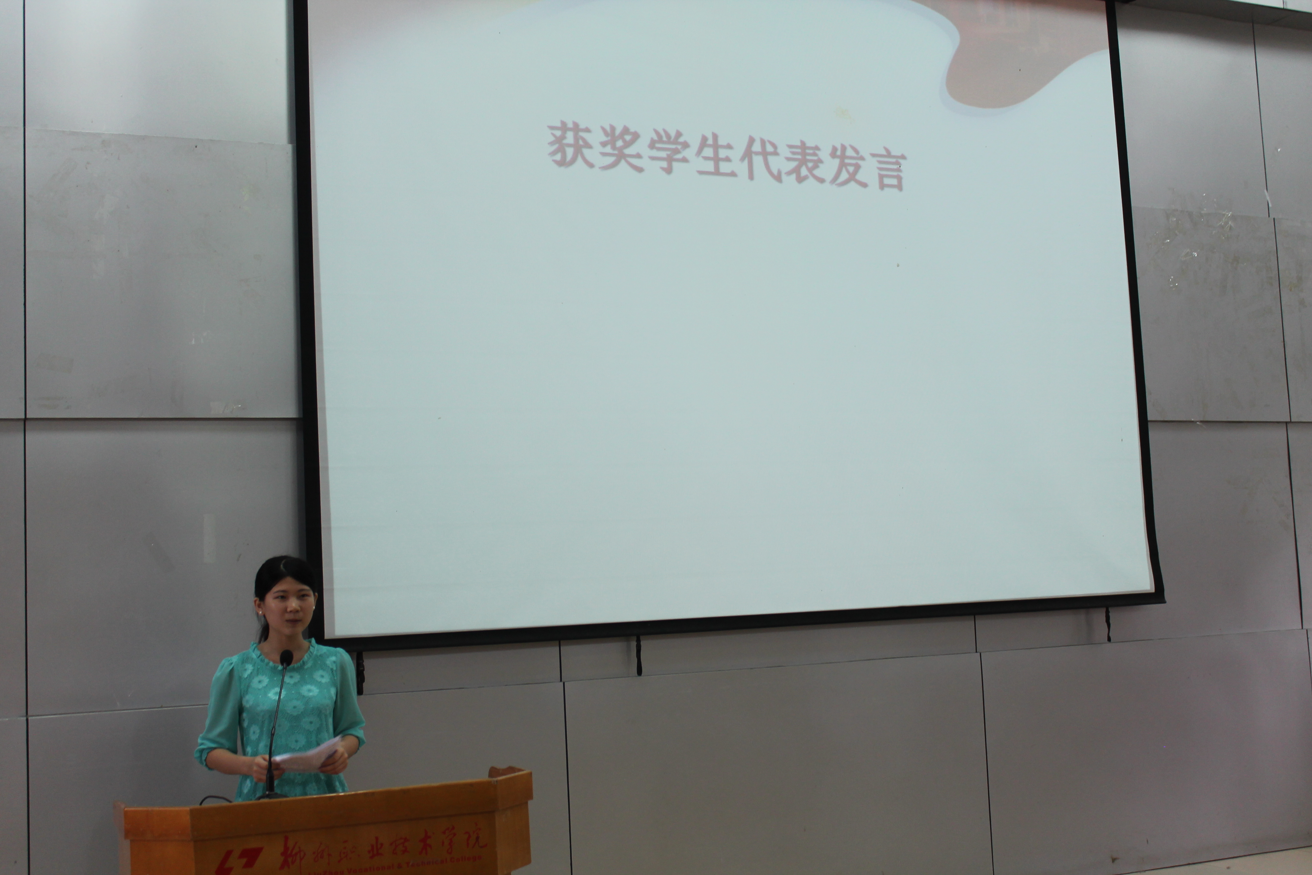 资助政策宣传月活动获奖学生代表、2012级会计电算化1班的周艺婷,安全文明宿舍获奖代表、2012汽车检测与维修技术3班蓝海航等两名同学分别上台发表感言。周艺婷同学从一名受资助者的角度,讲述了在资助政策的关怀和帮助下不断成长的经历,表示要做一个有用的人,来回报国家,服务社会,让青春不留遗憾;蓝海航同学从营造宿舍氛围角度,讲述了一个良好的宿舍文化环境为个人健康成长成才起到积极的作用,表示要为创建安全、文明、和谐的校园环境贡献一份力量,让自己的大学生活变得更充实、更有意义。