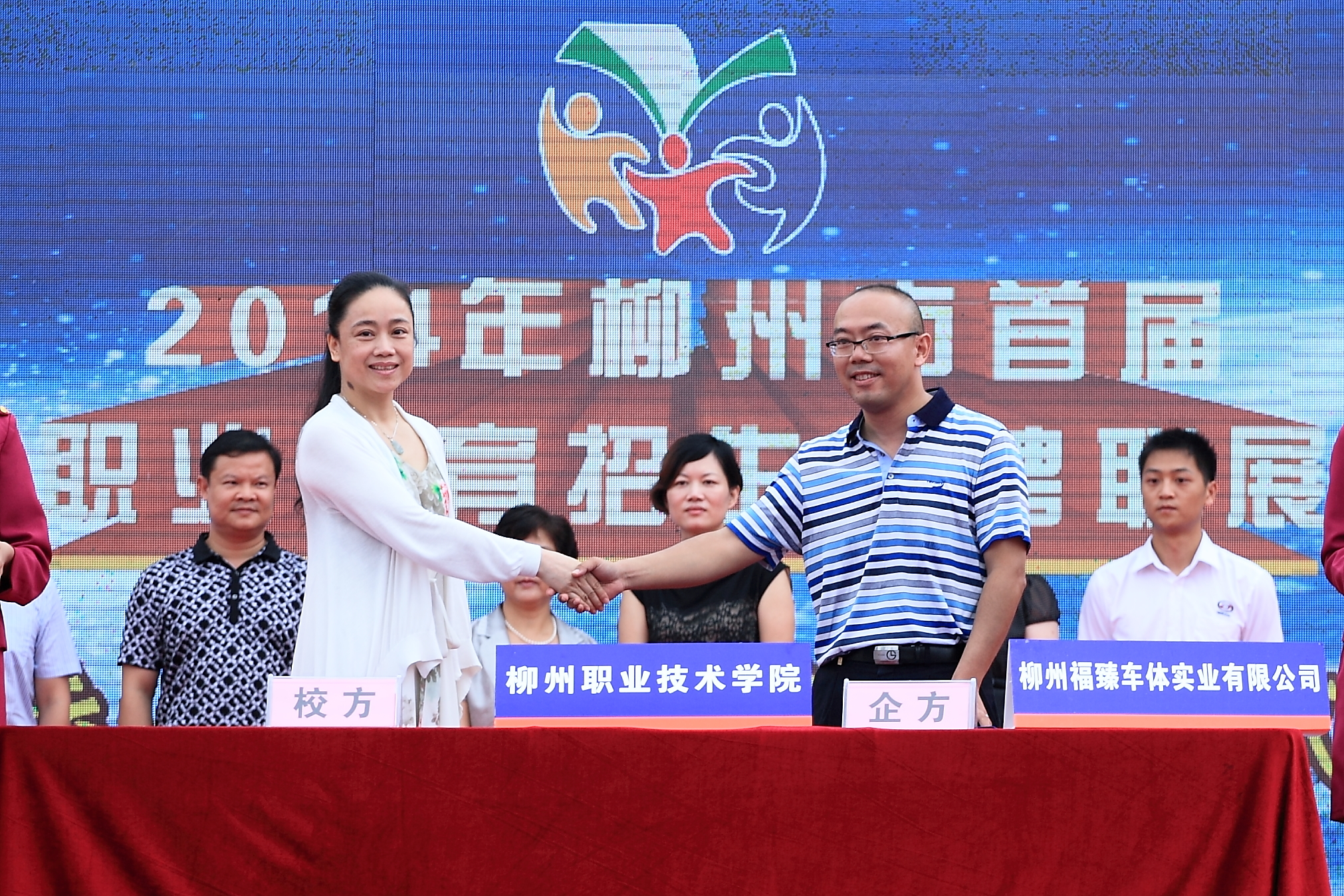在联展活动的校企签约环节,我院招生就业处黄莉处长还代表学院上台与柳州福臻车体实业有限公司签订了《高端应用型本科人才联合培养协议》。
