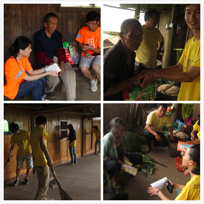 孤独的村落里,村民中大多是孤寡老人和小孩。在炎热的七月,村民依旧日出而作日入而息。志愿者的到来,为村庄增添了不少热闹。年轻的志愿者走访村民搞社会调研,他们带着面条、洗衣粉、毛巾等物资去看望村中的孤寡老人、贫困户,村民们热情地拿出油茶招待大家,志愿者们帮忙打扫房屋、挑水、陪长辈聊天,“看到你们就像看到我外出打工的孩子!”这一句朴实的话语感动了在场的大学生们。“我们永远都是你们的儿女,有机会会来看你们的。”志愿者还为村民放电影,一部部精心挑选的革命经典老电影《地道战》《举起手来》等吸引了不少村民观看。