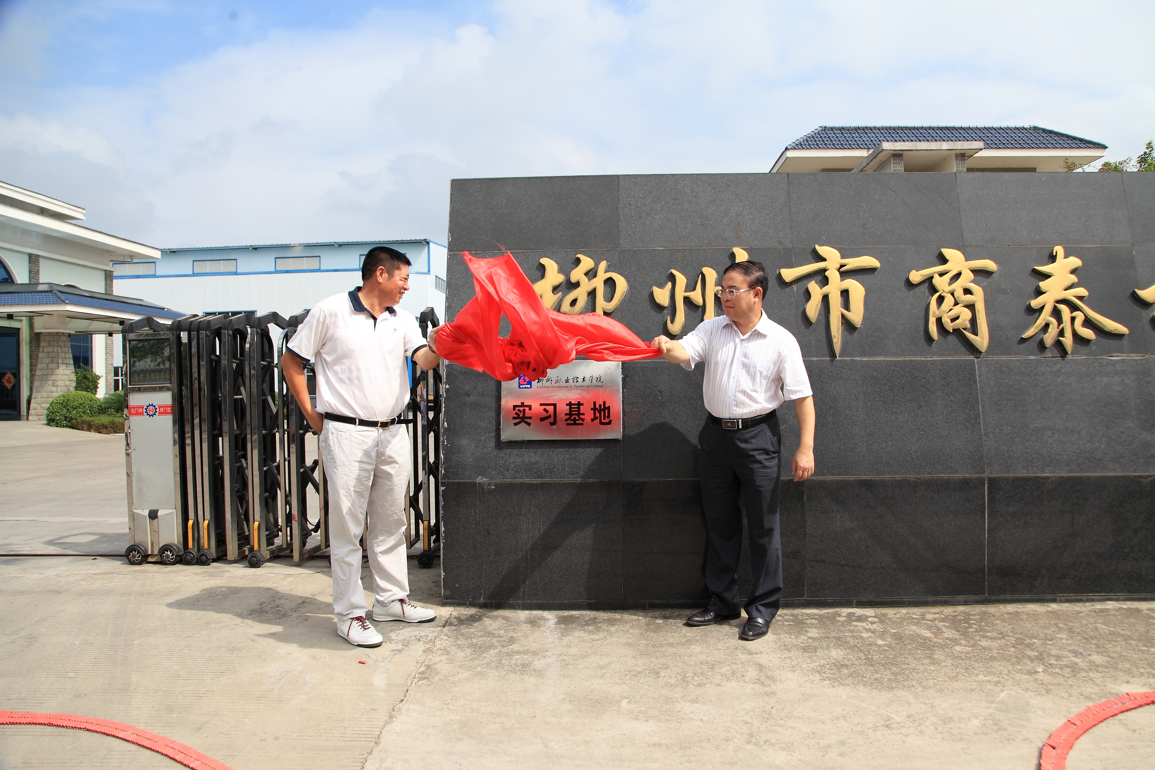新闻网消息(记者石玉丹 朱敬民报道摄影)2014年9月18日上午,位于柳州市新兴工业园区的柳州市商泰机械有限责任公司(下简称商泰)门前鞭炮震天、礼花纷纷——我院党委书记朱伟才和商泰总经理蒋玉明,一同走到写有“柳州职业技术学院、柳州市商泰机械有限责任公司实习基地”字样的牌匾旁,将覆盖其上的大红花轻轻摘下——我院与商泰公司共建校企合作实习基地揭牌仪式在这里举行。