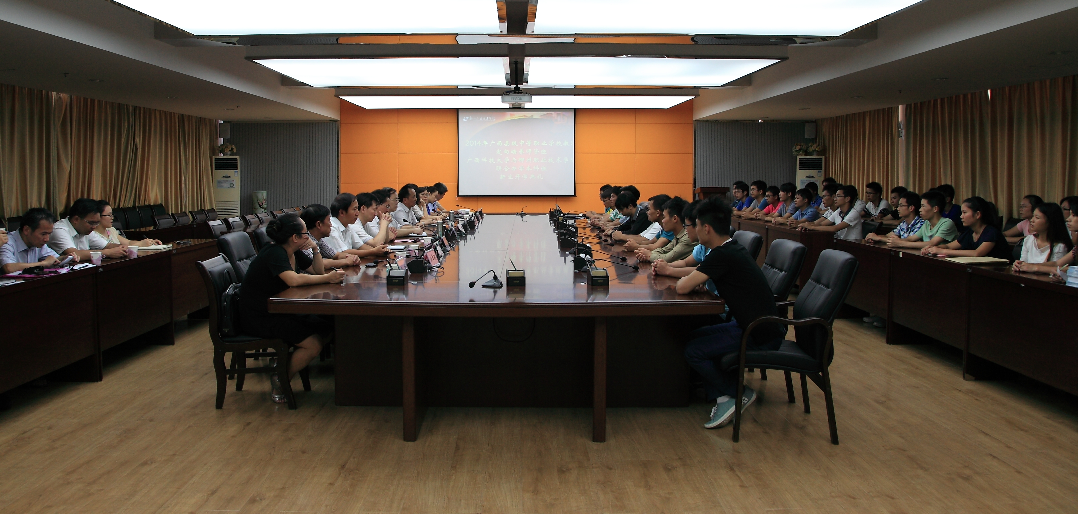 2014年9月17日15:30,广西县级中等职业学校教师定向培养师资班暨广西科技大学与柳州职业技术学院联合办学本科班新生开学典礼,在我院行政楼300会议室举行。广西科技大学职业技术教育学院副院长谭立平、我院党委书记朱伟才、院党委副书记阳旭,副院长鞠红霞及相关部门领导参加,开学典礼由院党委副书记阳旭主持。