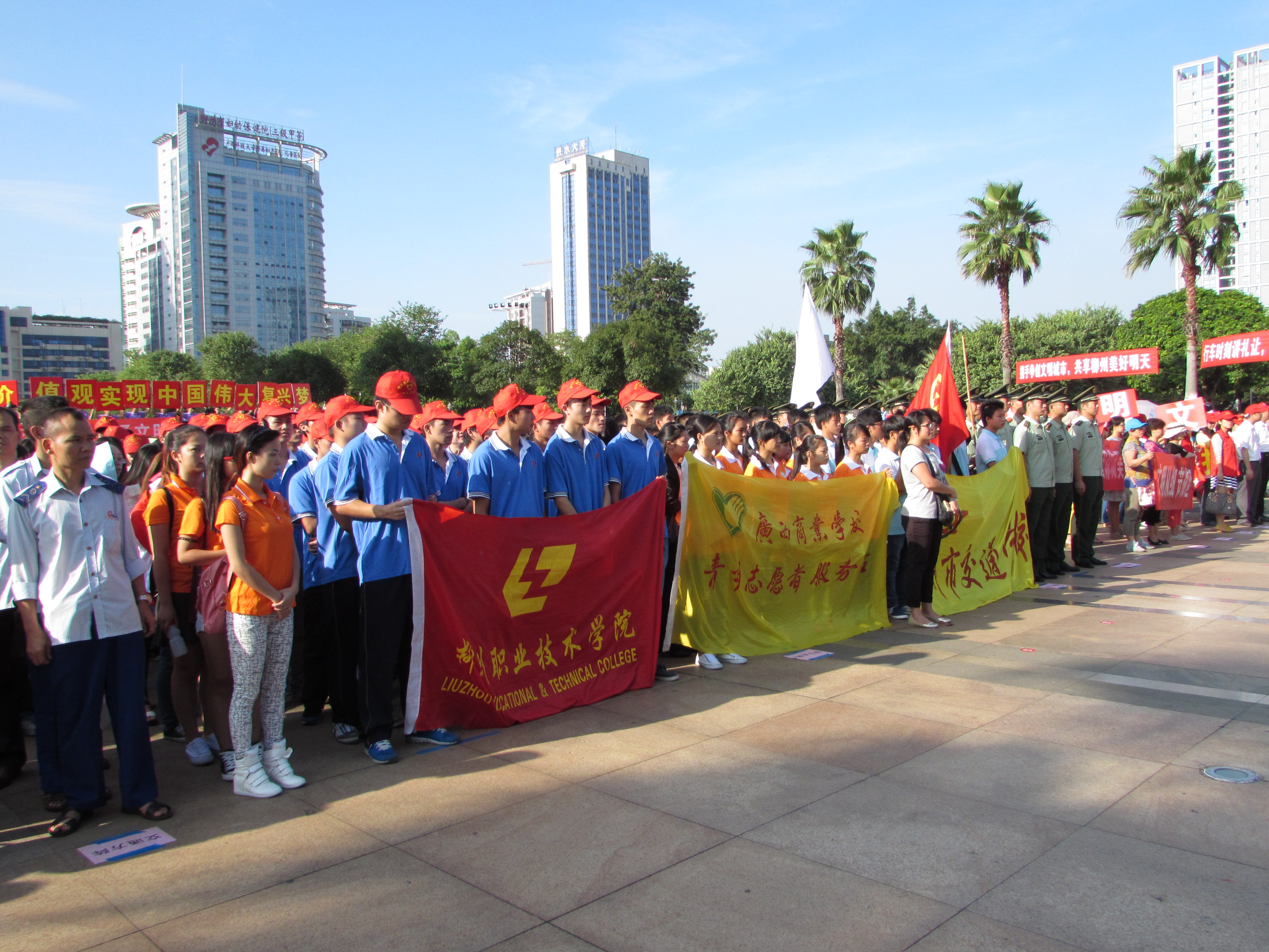 为了培育和践行社会主义核心价值观,传递文明交通正能量,树立文明交通新风,共同打造文明、和谐、安全、有序的交通环境,2014年9月20日上午,我院200余名志愿者参加了由柳州市委宣传部、市委文明办在市民广场开展的“斑马线上的文明”主题活动启动仪式。