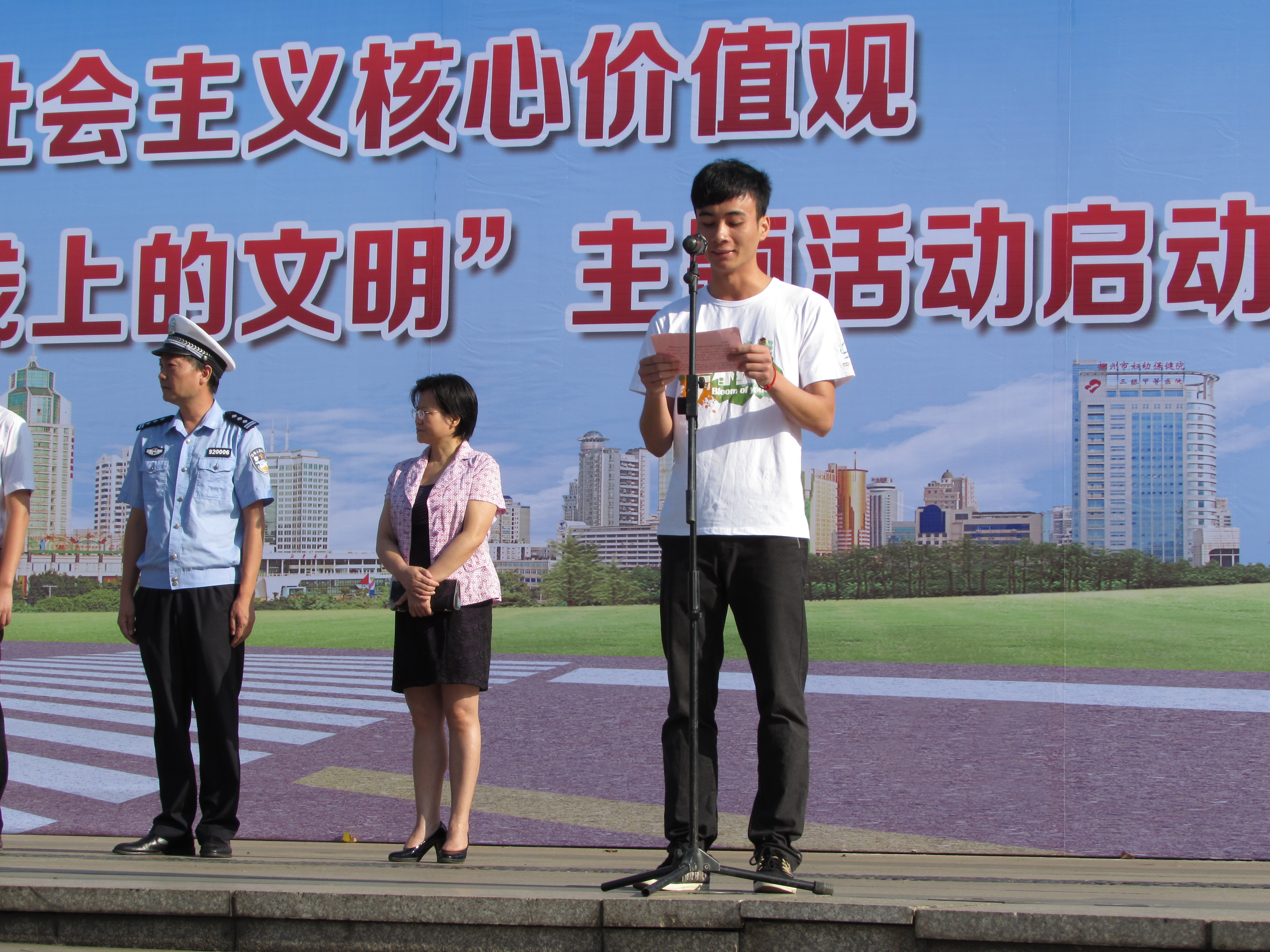 早上8点30分,活动正式开始,柳州市有关单位、妇联、武警以及广大市民共同参与到活动中。我院学生会干部李承文同学作为全市青年学生代表在现场宣读倡议书,号召全市人民文明出行,自觉践行“车让人,人让车,车让车,人让人”,实现人、车、路和谐相处,交警代表、公交车驾驶员代表也先后在仪式上做了发言。