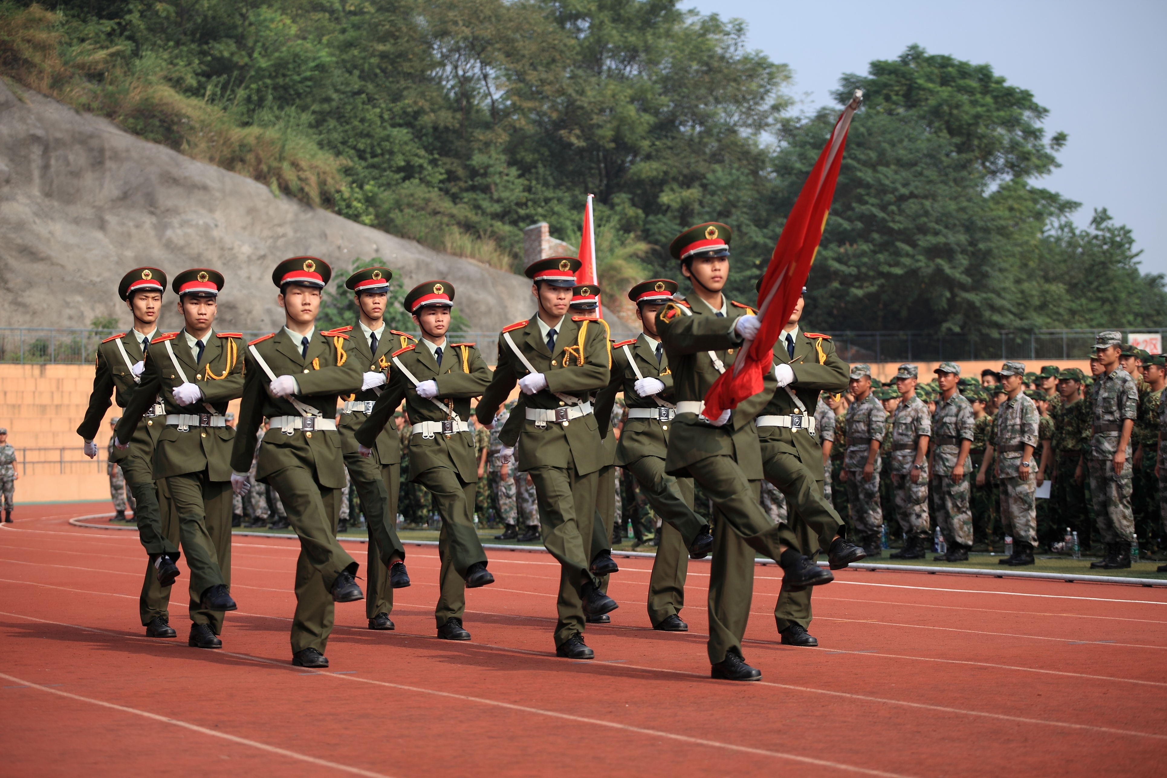拉歌结束后,会操新生以挺拔的军姿、整齐的步伐行进到主席台前,各方队表演了立正、稍息、跨立、停止间转法、敬礼,然后由教官带领,跑步离开。整个过程,学生们都能严格按军人的标准要求自己,一丝不苟、认认真真接受与会领导和部队首长的检阅。