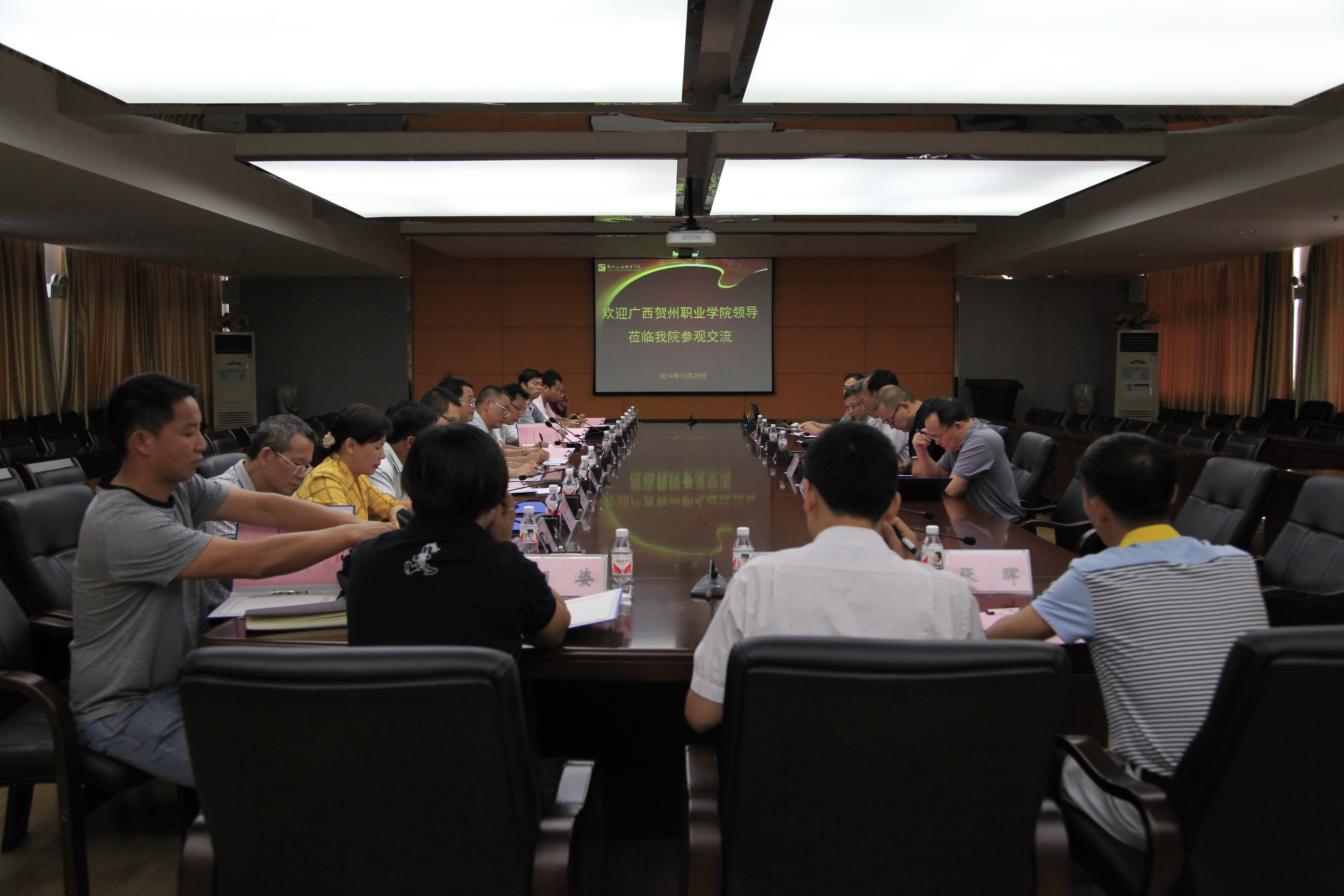 2014年10月29日上午,广西贺州职业学院党委副书记、副院长施国生,广西贺州职业学院党委副书记、纪委书记陈武强,贺州市工信委副主任蒋华庆,人社局副局长莫新杰等一行15人,到我院访问交流。院长石令明陪同来访客人参观了我院机电实训基地、先进制造实训工厂,之后在300会议室与施国生副院长一行举行座谈,交流探讨关于学校建设与管理,教育投入、人才使用及编制设定等问题。学院副院长杨毅、瞿凡以及继续教育中心(校企合作处)、教务与实训处、党(院)办等部门负责人参加了座谈。