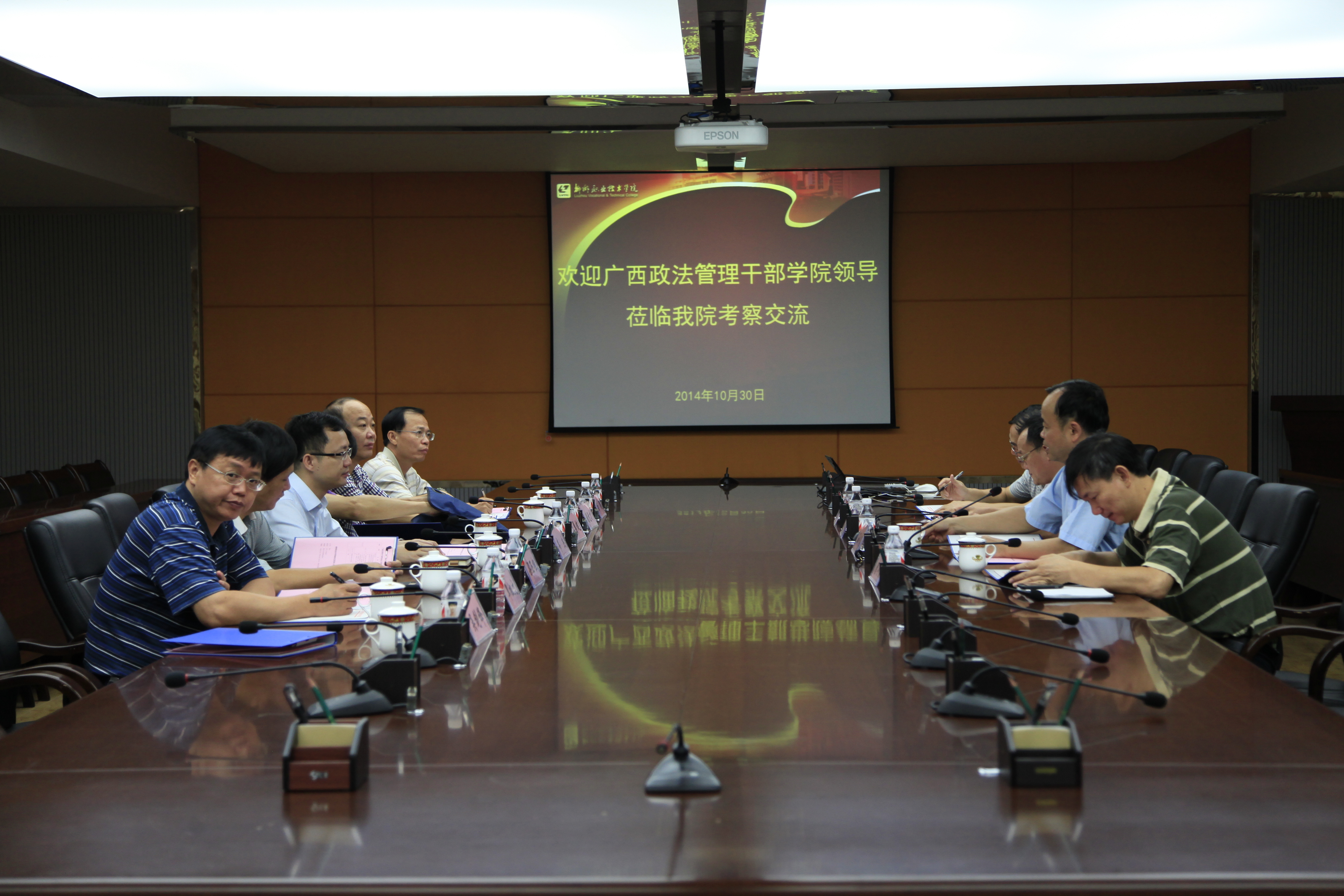 2014年10月30日上午,广西政法干部管理学院院长韦杰一行7人到我校考察交流。学院院长石令明在300会议室与来访客人进行了座谈,交流探讨学校的发展建设与管理等方面问题。学院学工处、教务处及党(院)办负责人参加了座谈。