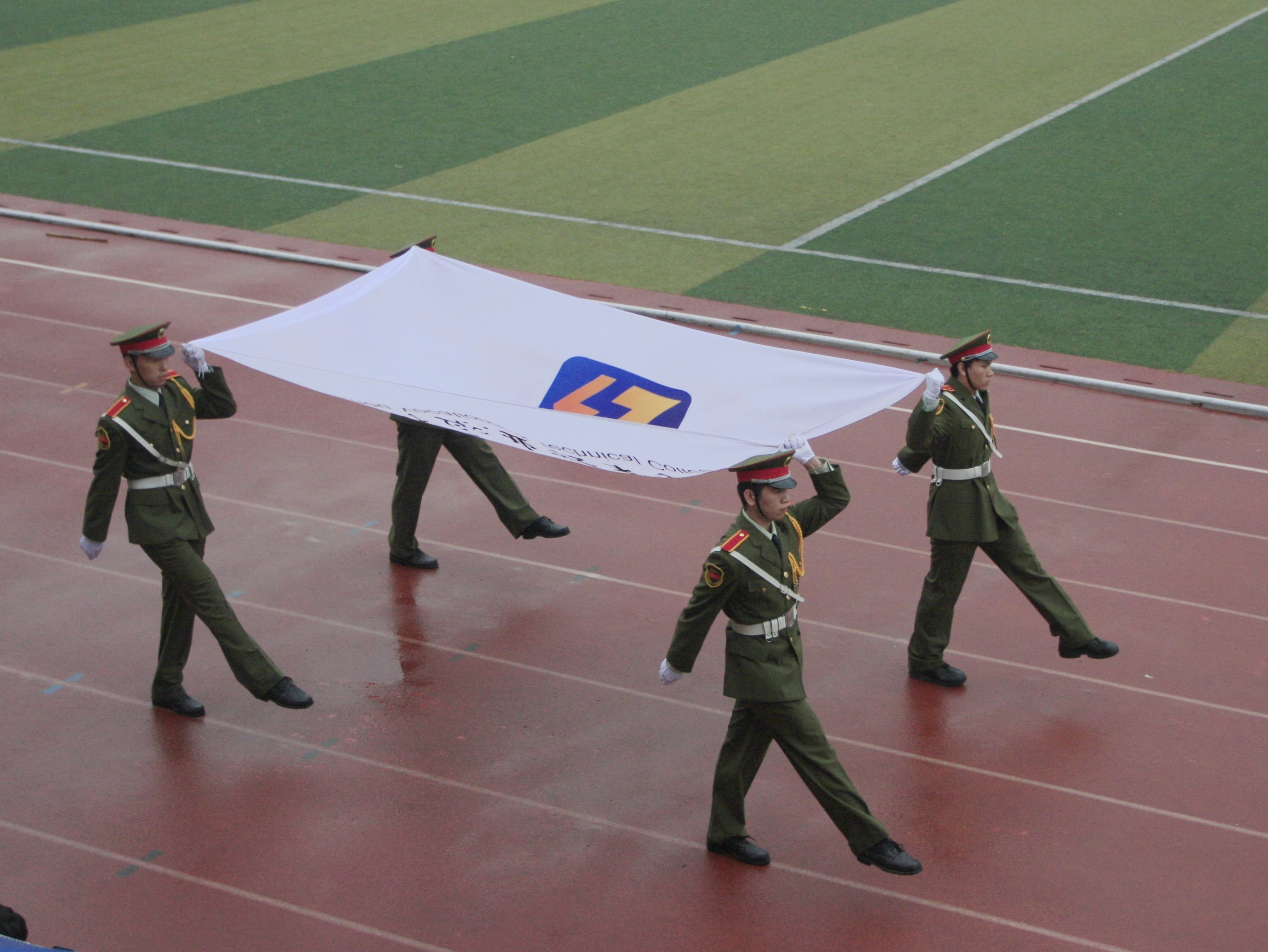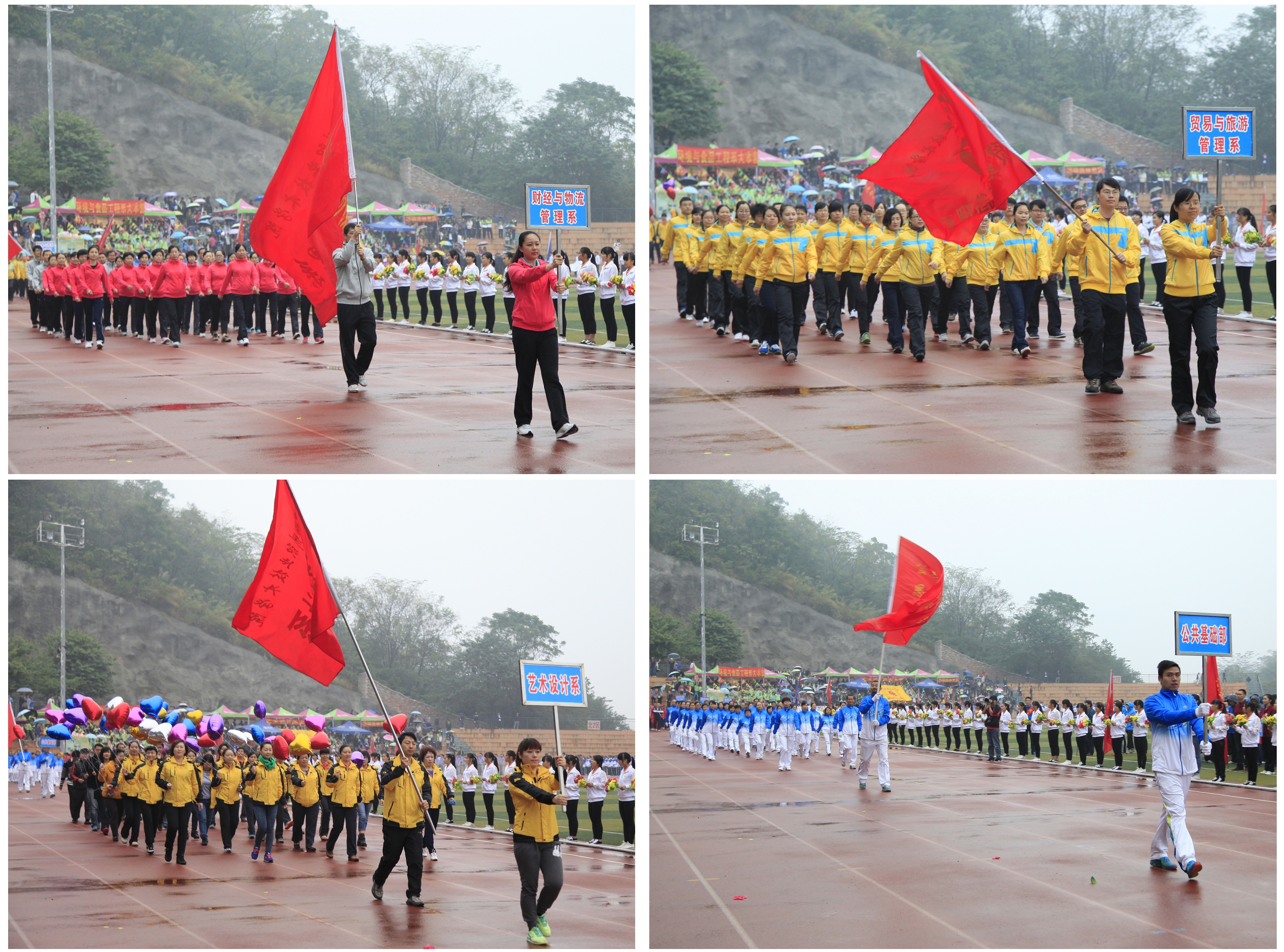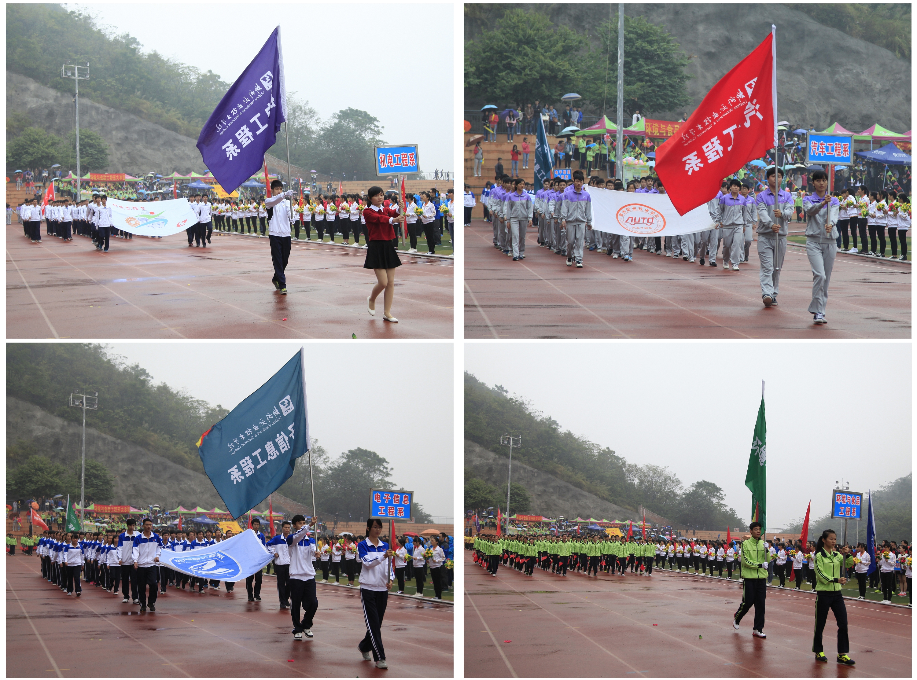 在雄壮有力的“运动员进行曲”乐声伴奏下,国旗班队员护卫着国旗、会旗、校旗,依次入场;统一设计、精心制作的运动会会旗、校旗和各系系旗在此次运动会上的“处女秀”以及首次在校运会开幕式上增设奏唱校歌、升校旗这一议程是一大亮点;轻快的音乐声中,百名女生组成的鲜花队雀跃出现,她们摆成“NO.1”队形,表达了竞技场上“勇争第一”的拼搏精神,随即,持手捧花的女生们分散到球场边伫立,以示“鲜花迎宾”之意。跟着走过来的是机电系方阵、裁判员、汽车工程系、电子与信息管理系、环境与食品工程系、财经与物流管理系、贸易与旅游管理系、艺术设计系、公共基础部和行政部门十个方阵,各系部方阵领队手执由宣传部统一新设计的系旗,或挥舞彩旗,或高呼口号,或放飞气球,以独有的方式展现各方阵的风采。