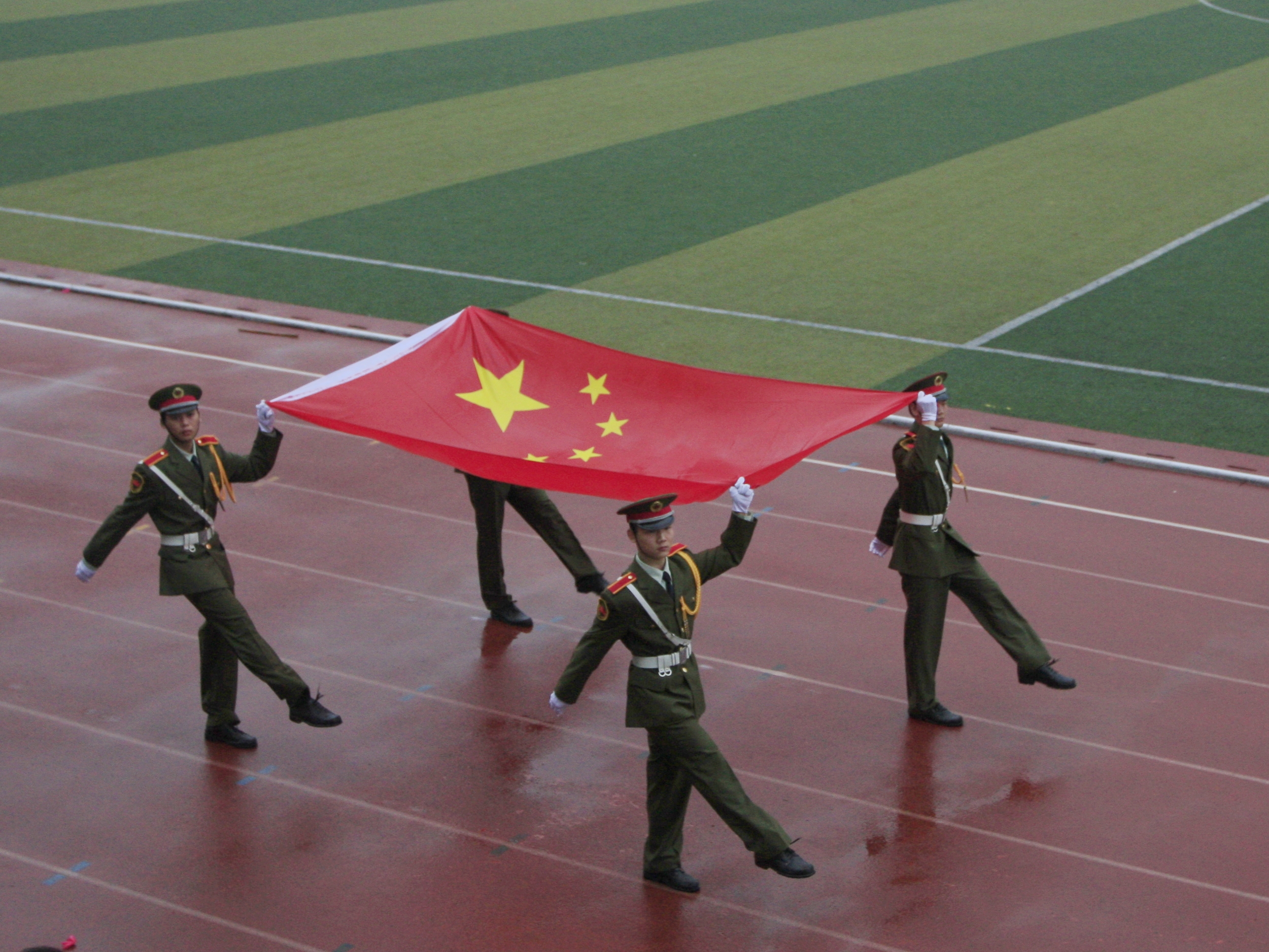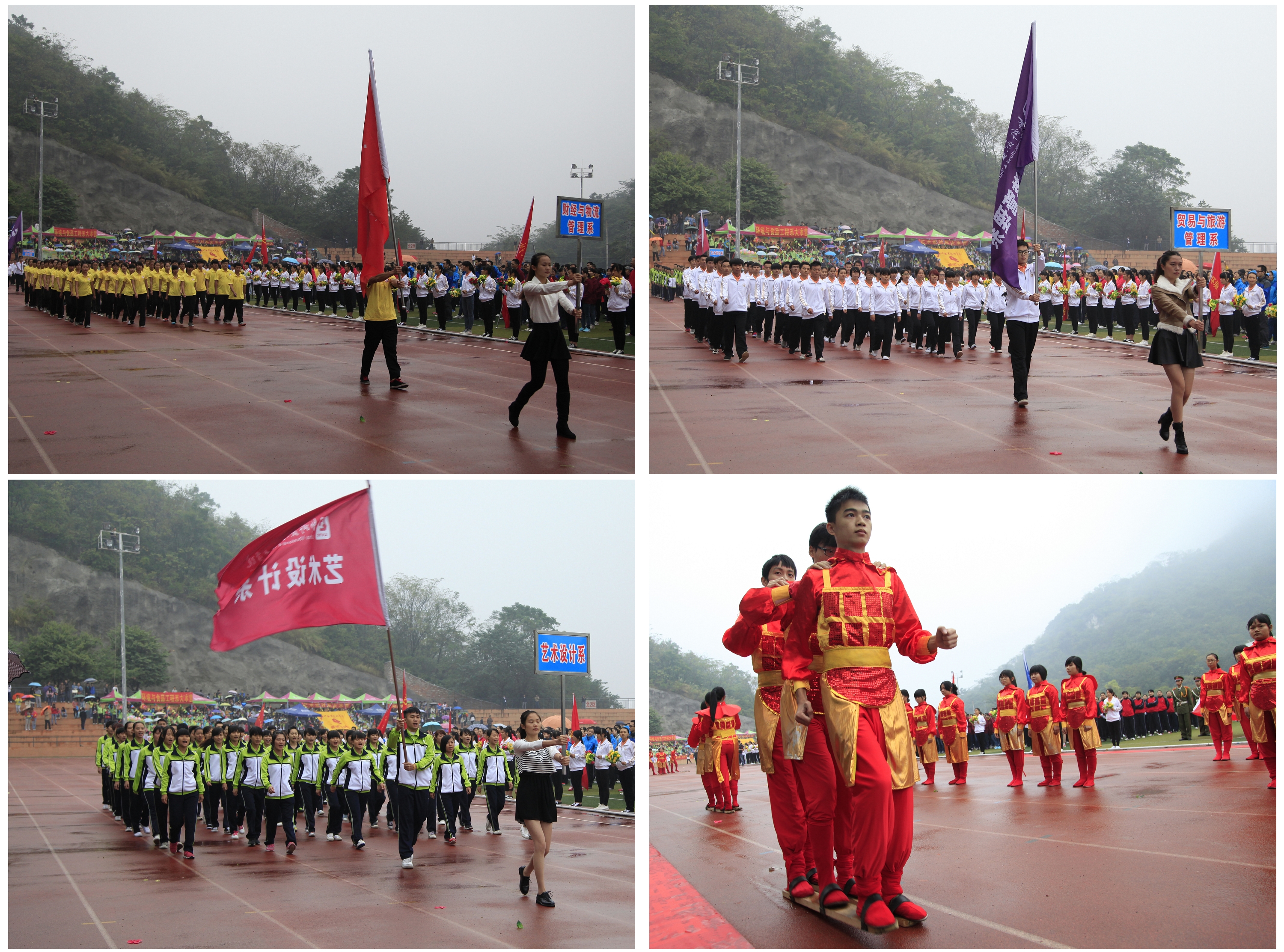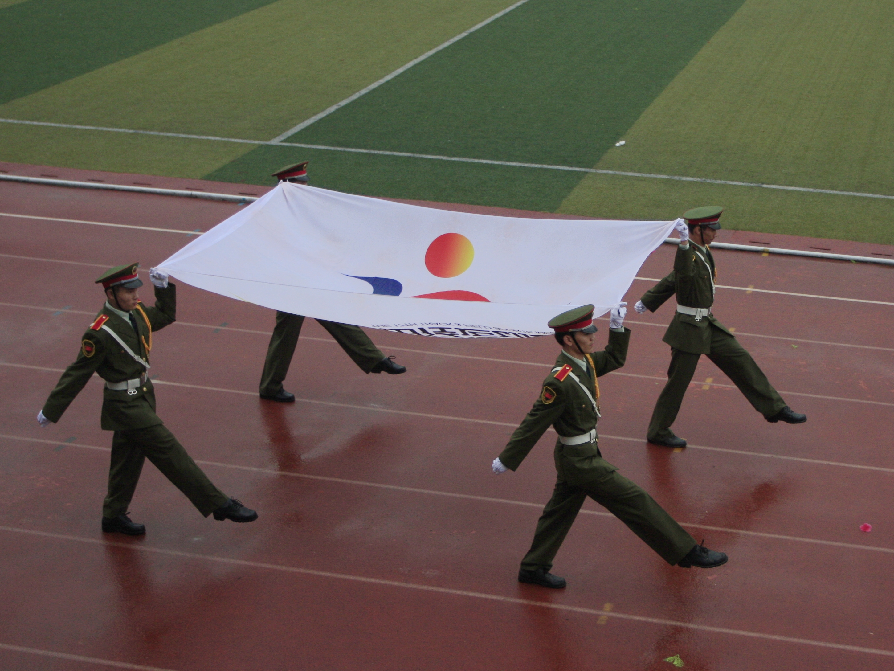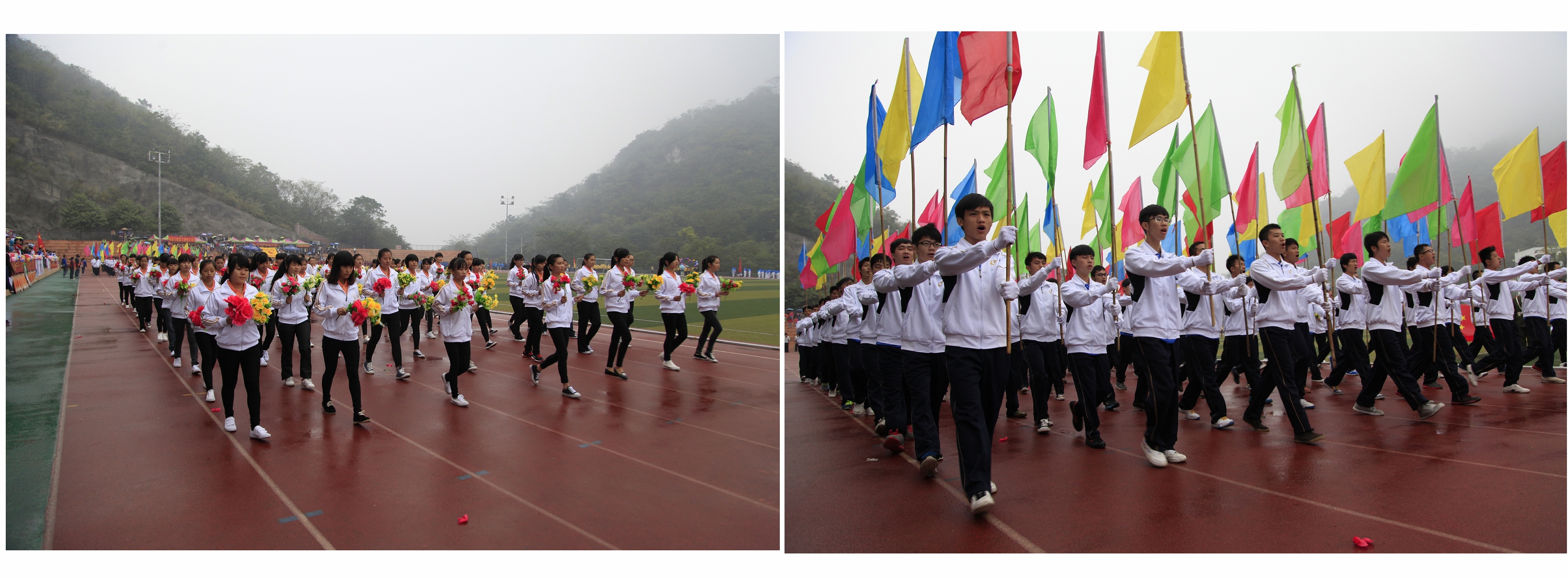 在雄壮有力的“运动员进行曲”乐声伴奏下,国旗班队员护卫着国旗、会旗、校旗,依次入场;统一设计、精心制作的运动会会旗、校旗和各系系旗在此次运动会上的“处女秀”以及首次在校运会开幕式上增设奏唱校歌、升校旗这一议程是一大亮点;轻快的音乐声中,百名女生组成的鲜花队雀跃出现,她们摆成“NO.1”队形,表达了竞技场上“勇争第一”的拼搏精神,随即,持手捧花的女生们分散到球场边伫立,以示“鲜花迎宾”之意。跟着走过来的是机电系方阵、裁判员、汽车工程系、电子与信息管理系、环境与食品工程系、财经与物流管理系、贸易与旅游管理系、艺术设计系、公共基础部和行政部门十个方阵,各系部方阵领队手执由宣传部统一新设计的系旗,或挥舞彩旗,或高呼口号,或放飞气球,以独有的方式展现各方阵的风采。