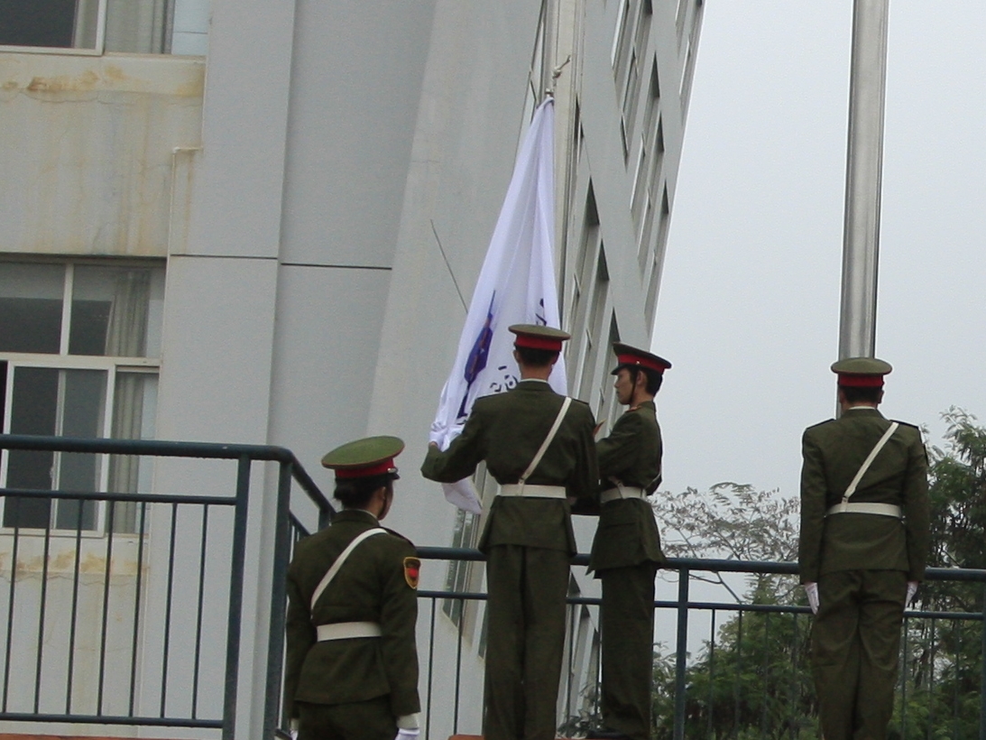 之后,升国旗、奏国歌,升院旗,奏校歌,全院师生向国旗、校旗所在方向行注目礼;校旗旗面以白色为底、以湖蓝色学院LOGO为主的核心图案镶嵌其上,简洁明了;校歌则贯穿着激动人心的轻快鼓点,旋律昂扬奋进,让全院师生增添了一份集体归属感和凝聚力。