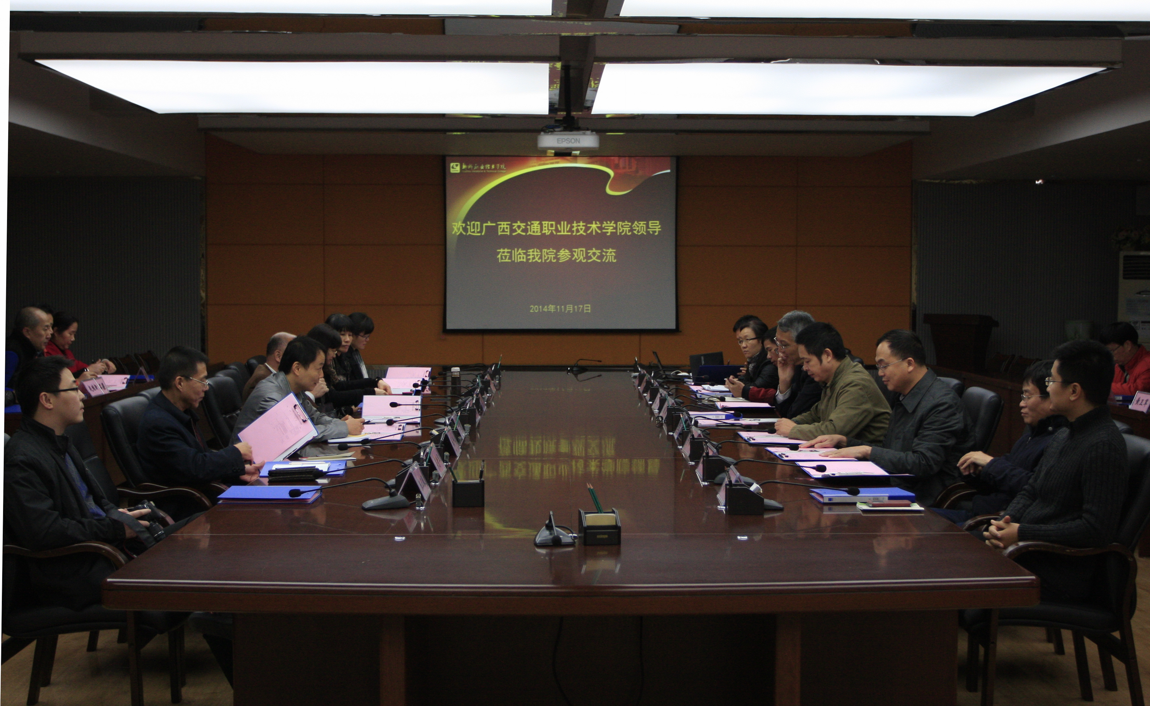 新闻网消息(通讯员 院办黄俊 摄影朱敬民、吴健宁)11月17日下午,广西交通职业技术学院副院长黄琼念、陈海峰率该院党委、行政、人事、教务、后勤保卫、财务、教学督导以及各教学系部负责人等一行16人,到我院访问交流。学院副院长杨毅、瞿凡陪同来访客人先后参观了我院机电实训基地、先进制造实训工厂、先进制造信息系统实训室、汽车实训基地、“一站式”学生服务中心,之后在300会议室座谈交流。我院各相关部门及电子工程系、汽车工程系、财经与物流管理系、艺术设计系、公共基础部等部门负责人参加了座谈会。