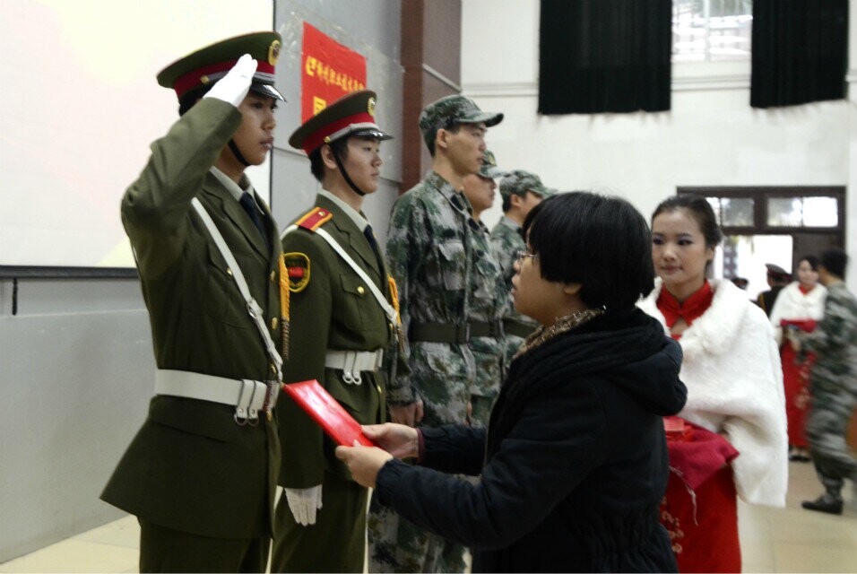 院团委王慧书记首先向国旗班第四届全体国旗班队员所作出的努力和贡献表示诚挚的感谢,对他们取得的成绩表示充分肯定,并向今年退役的队员表示真诚的问候与祝福,最后,王书记向新一届国旗班的同学表达了最热烈的祝贺并提出了殷切的希望,希望新一届国旗班成员要坚持发扬国旗班精神,强化责任意识,力求全面发展,继续为学院争光。 -