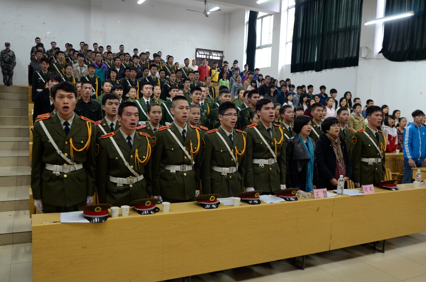 新闻网消息(通讯员 院国旗班 赵俊杰 摄像杨世海、院国旗班韦昌志)2014年11月15日上午,我院第四届国旗班表彰大会暨新成员入班仪式在本部博闻楼110室隆重举行。国旗飘飘,国徽熠熠,我院国旗班迈着坚实有力的步伐已走过四年的风风雨雨。院团委王慧书记、国旗班班主任周虹老师以及嘉宾杨世海老师出席了此次大会,此外学院第四届、第五届国旗班全体成员以及各系学生会、社团代表,还有来自柳州市各兄弟院校国旗班代表,共计200多人参加了此次大会。