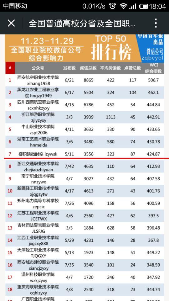 新闻网消息(记者 崔智慧 左妮红)好消息!继11月24日柳州职业技术学院官方微信公众号“柳职院微时空”首次冲榜就位列中国青年报全国职业院校平均阅读量排行版TOP50第11位后,在该报12月1日发布的全国职业院校微信公号综合影响力排行榜TOP50榜单中,学院官方微信公众号“柳职院微时空”再创新高,综合指数WCI高达424.87,进入了全国高职院校前十,位列第七,在广西高职院校中排名第一,在广西普通高校中排名第二。