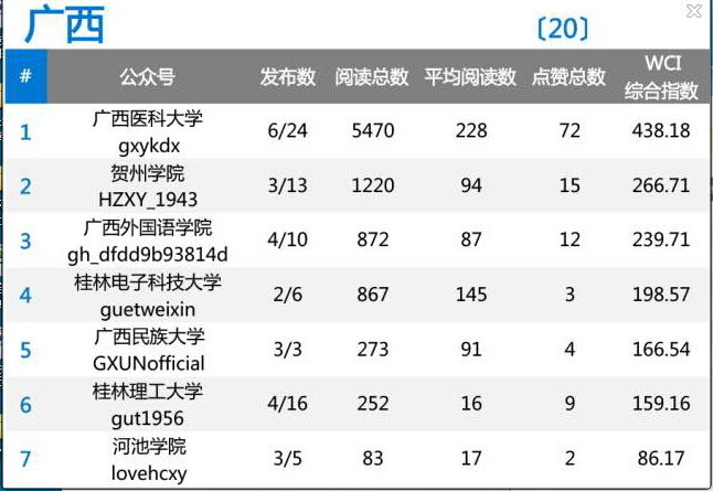 广西普通高校公众号排名,我院的综合指数仅次于第一名的广西医科大学。