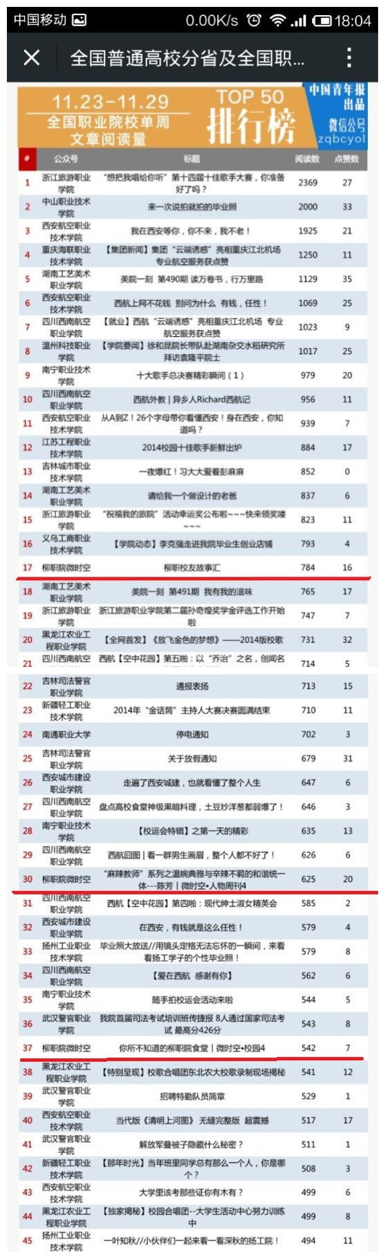 此外,在中国青年报本周同时发布的全国职业院校单周文章阅读量排行榜TOP50榜单上,《柳职校友故事汇》和《麻辣教师系列之温婉典雅与辛辣不羁的和谐统一体---陈芳/微时空.人物周刊4》以及《你所不知道的柳职院食堂/微时空.校园4》也榜上有名,分别位列第17、30、37。