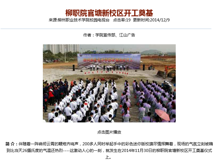 “影像柳职”栏目设置在学院新闻网网页右侧,首期“影像柳职”栏目内容包括官塘新校区开工奠基、2015届毕业生双选会、学院第十七届运动会、宝钢湛江班的“小苹果”、“柳职梦飞翔MV”、“舞动柳职”等多个声画结合的电视MV。今后,学院宣传部将着力打造这一特色新闻栏目,对学院重大事项、大型活动、主要赛事等相关的影像资料进行采集,制作成可视性强的立体声画电视栏目,与新闻网上的内容及新闻中心旗下的院报等平面媒体相得益彰,与新媒体微信公众平台“柳职院微时空”相互渗透,以多种多样的呈现方式,多角度、多层面、全景式立体展现学院的良好形象,努力打造“传统媒体与新兴媒体互相融合、互相渗透、互相补充、一体化发展”的全媒体格局。
