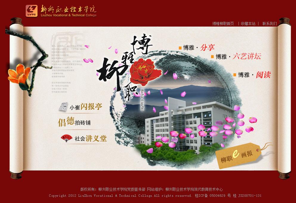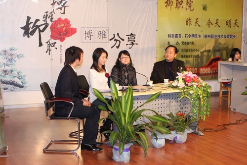 2009年11月开拍开播的《博雅•分享》校园电视访谈栏目以育人为本,坚持开放性、高雅性、定期性、互动性、群众性的原则,旨在架构校内外专家学者与高职学生的沟通桥梁,普及中国优秀传统文化,促进高职生增长知识、开拓视野、提高品位,培养其广博而高雅的人文素养,迄今已制作播出多期,在博雅柳职网站结集展示,供师生学习分享;以“用思考启发思考 用心灵感动心灵”为宗旨的博雅•六艺讲坛。至今已举办了100余场次的主题讲座,现场聆听讲座的学生已超万人次,于2012年被广西社科联确立为高校社科联开展学术活动资助项目。此后,随着《博雅•看柳职》、《博雅•小崔闪报亭》、《博雅•倡德拍砖铺》、《博雅•社会讲义堂》、《博雅•娱乐在线》、《博雅•创业人生》、《博雅•公益广告》等校园电视栏目的制作和播出,“博雅柳职”文化品牌的形式和内涵都得到了不断的丰富和完善,在传递新知识新事物,引导校园舆论,营造高雅而向上的文化氛围方面发挥了重要作用,在师生中产生了极大的反响,成为校园文化一道亮丽的风景线,充分发挥了校园文化培育人和塑造人的核心功能。