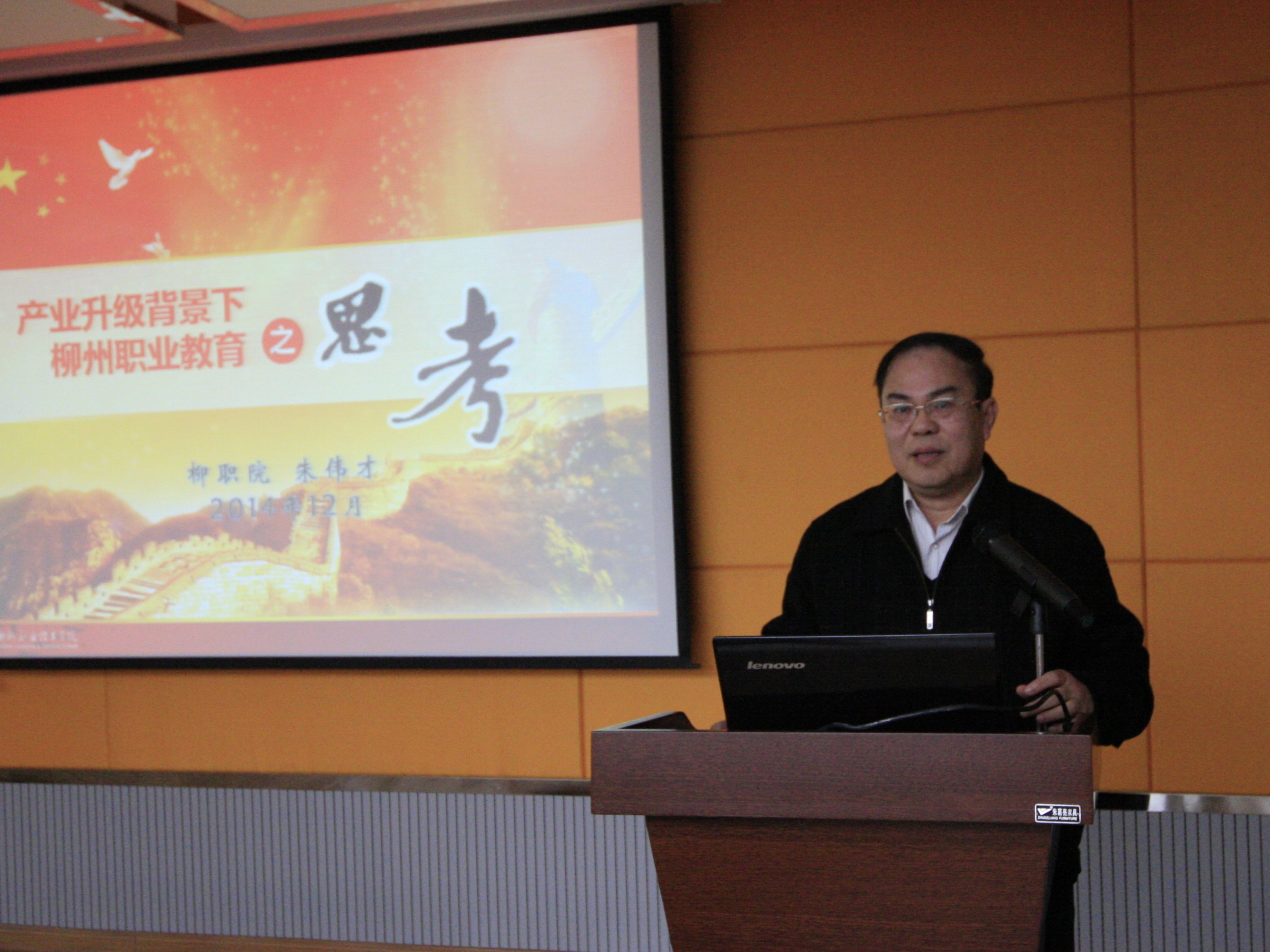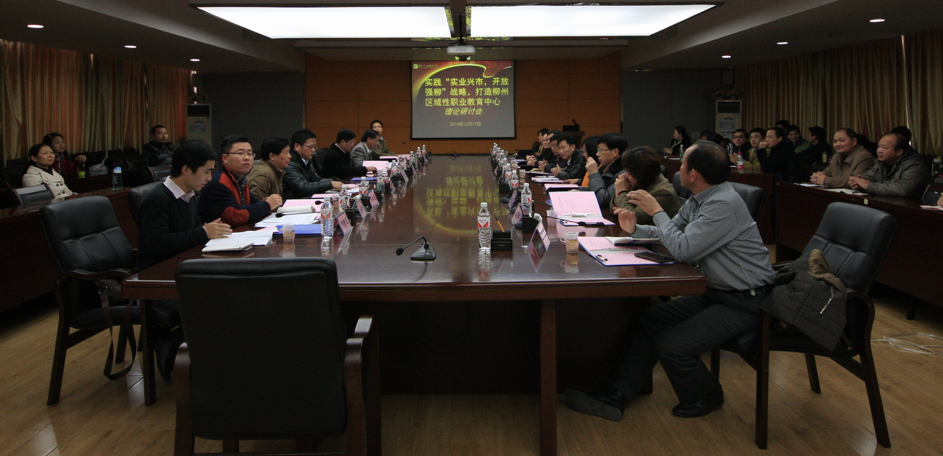 新闻网消息(通讯员/科技处 李庆原 摄影/宣传部 朱敬民、李晓枫、庞芝雅)2014年12月19日下午,由学院社会科学界联合会(简称学院社科联)主办的“实践‘实业兴市,开放强柳’战略,打造柳州区域职业教育中心”理论研讨会在行政楼300会议室顺利召开。研讨会由柳州职业技术学院党委副书记、学院社科联副主席阳旭教授主持。来自柳州市发展与改革委员会、中共柳州市委宣传部理论科(柳州市哲学社会科学规划课题办公室)、柳州市社科联、柳工路创制造科技有限公司的专家和来宾,以及来自学院公共基础部、财经与物流管理系、贸易与旅游管理系、学院行政部门的教师和管理人员共60人参加本次研讨会。