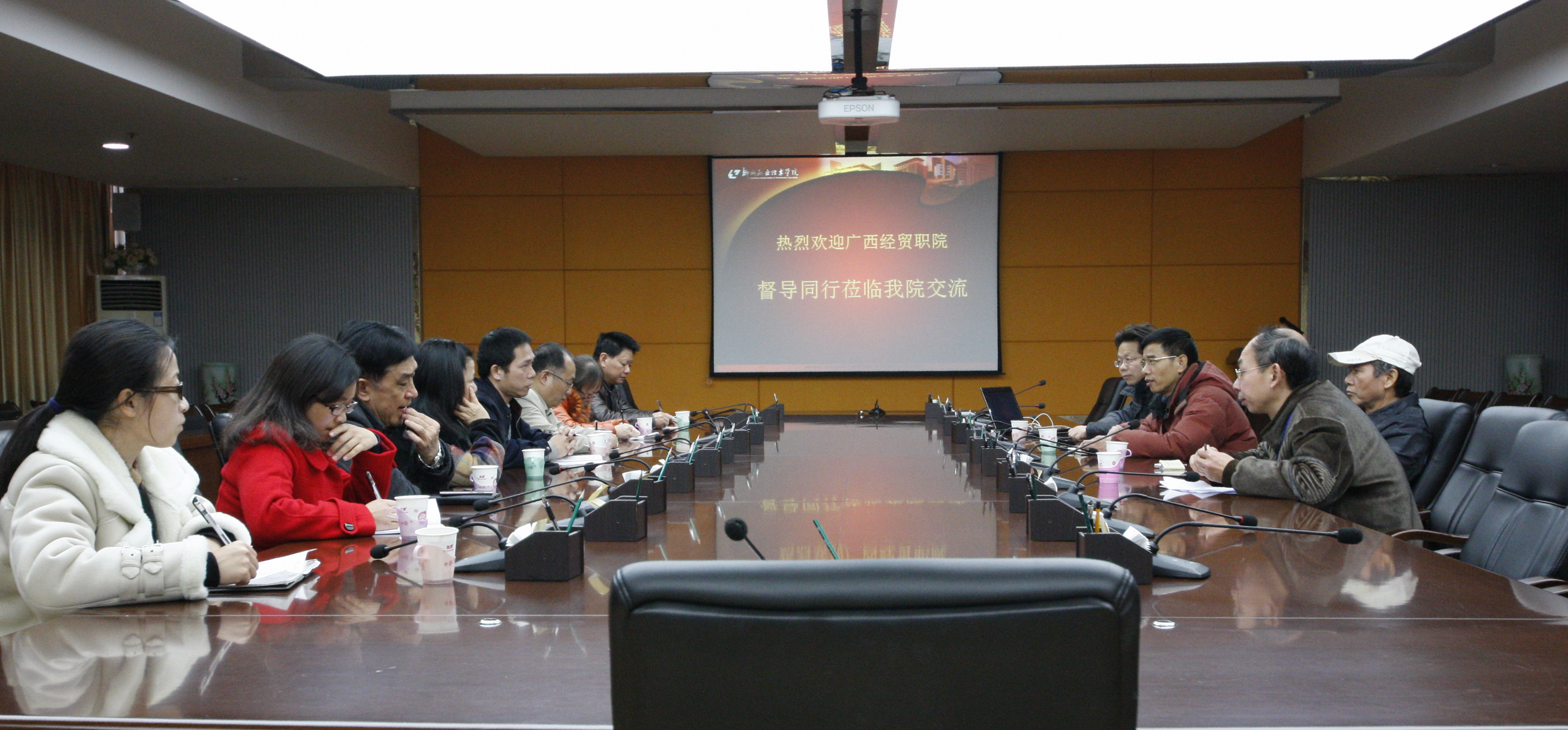 新闻网消息(通讯员/督导室 黄昆平、摄影/宣传部 朱敬民、首香英、潘维丽)2015年1月9日上午,广西经贸职业技术学院督导室副主任李康率该院新任兼职督导员一行9人,来我院交流督导工作经验,我院督导室主任傅昌德及部分专兼职督导员在行政办公楼300会议室热情接待了来宾。