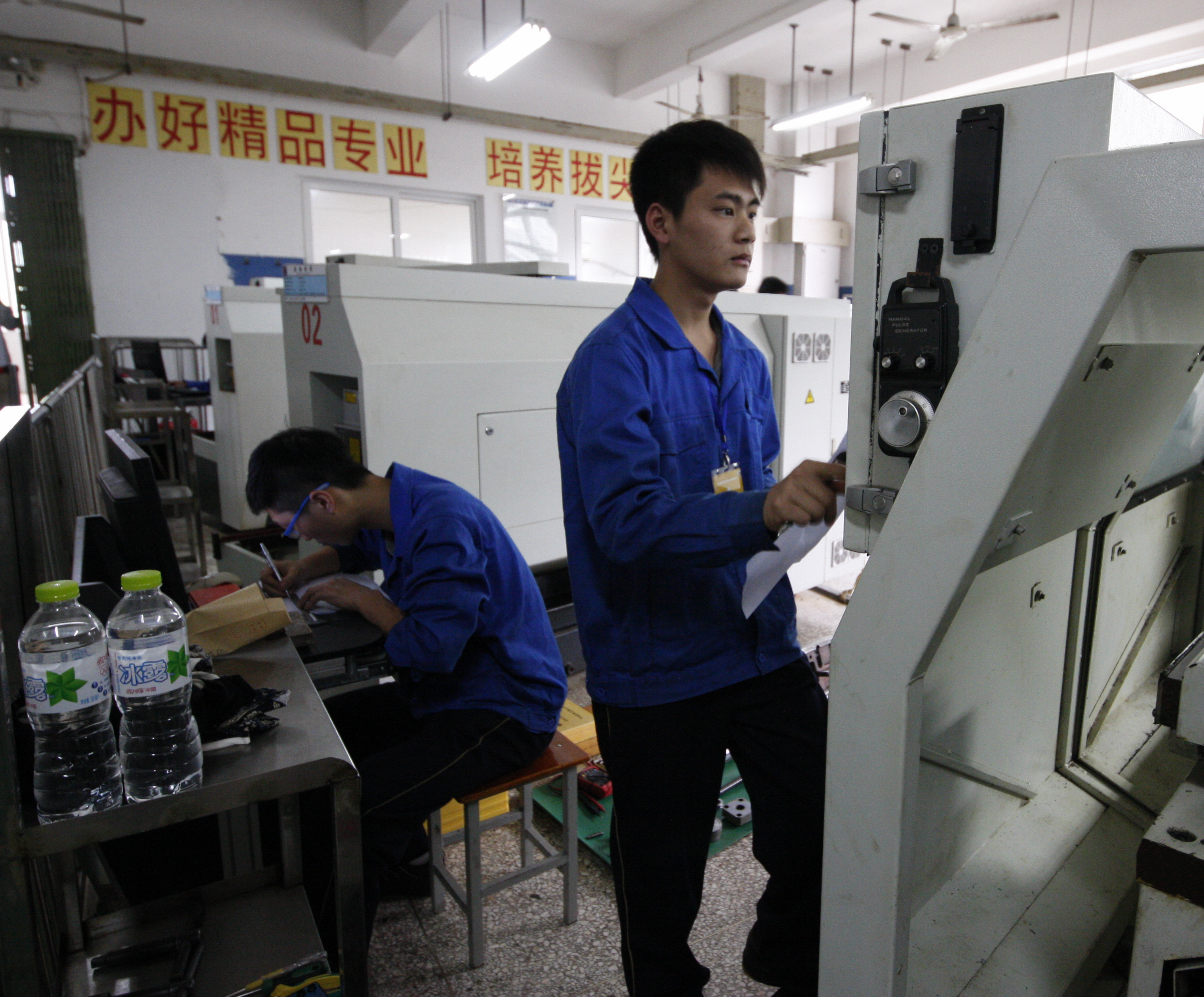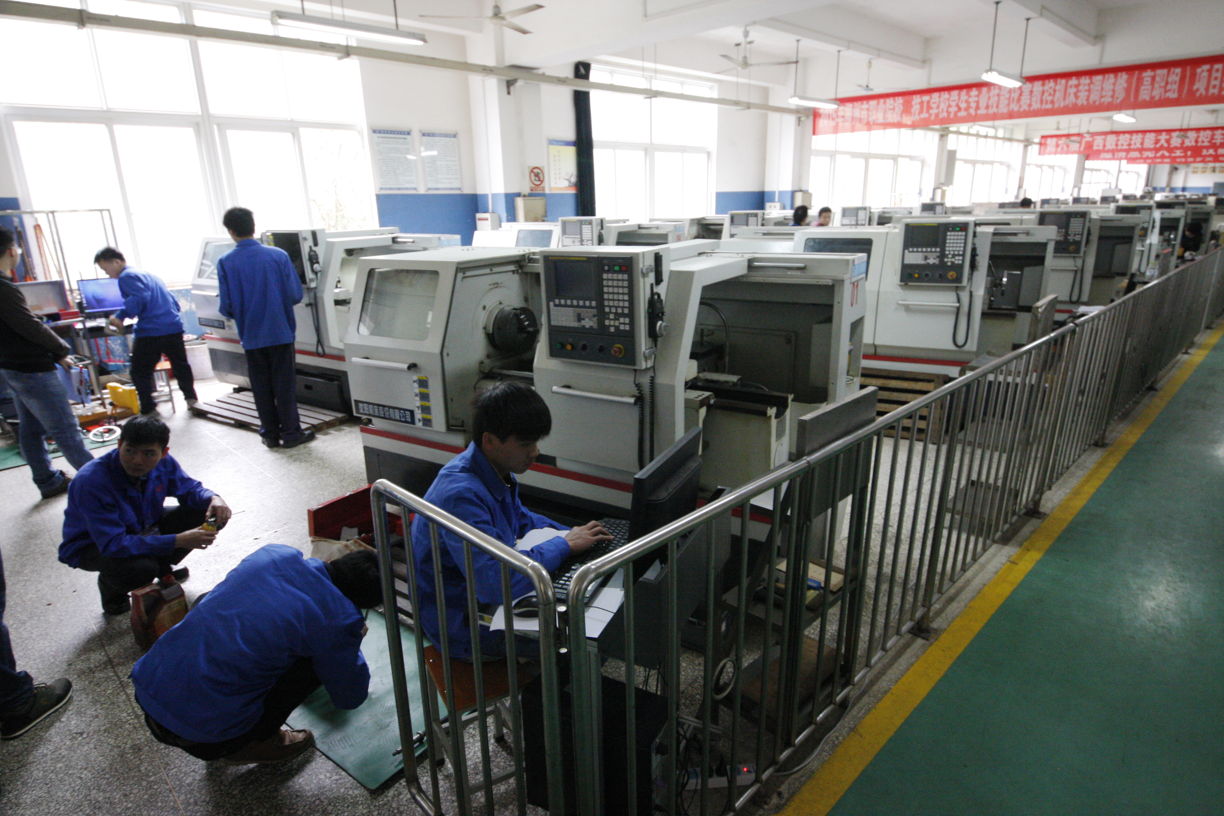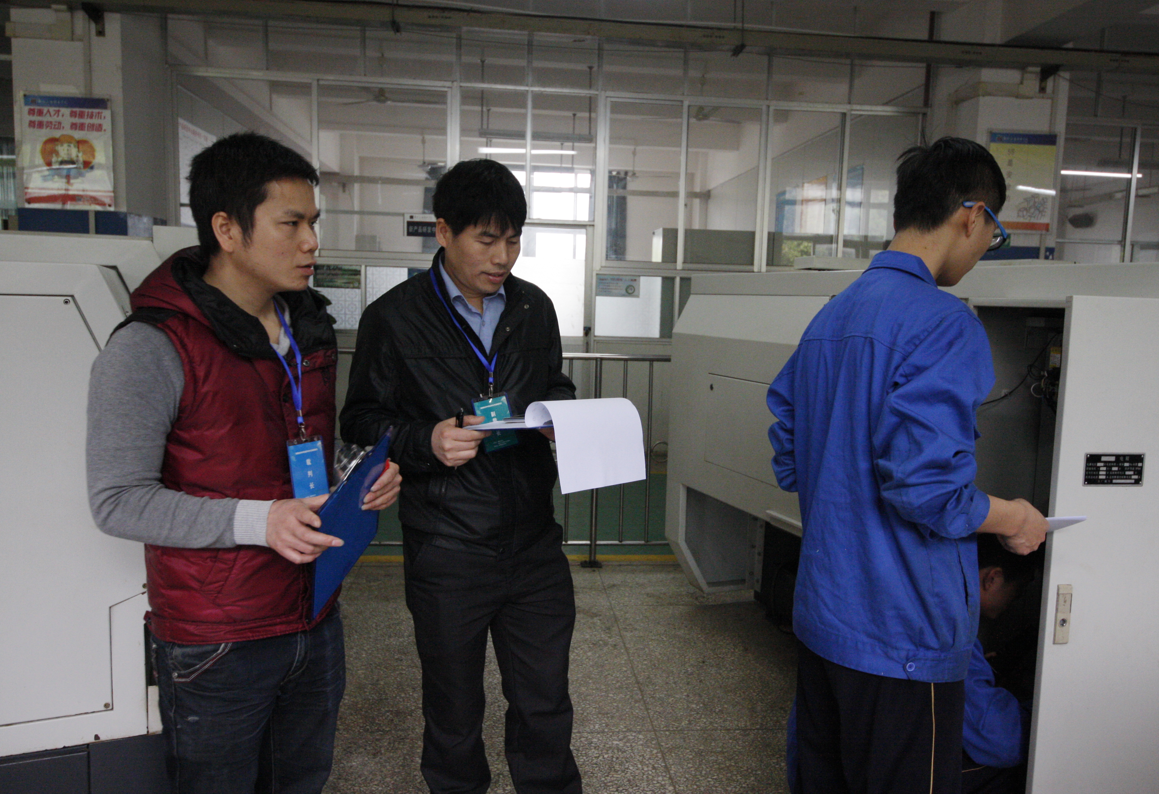 在天工楼三楼,来自柳职院、铁道职院、城职院三所院校的6支队伍12名选手正在各机床前操作,裁判来自采埃孚、五菱公司、柳机动力有限公司三家业内机加工水平领先企业。各参赛队要在规定时间内,利用现场提供的技术资料与允许自带的工量具,完成数控车床的机械安装与调试;机床功能检查、故障排除;试切件的编程与加工等任务。