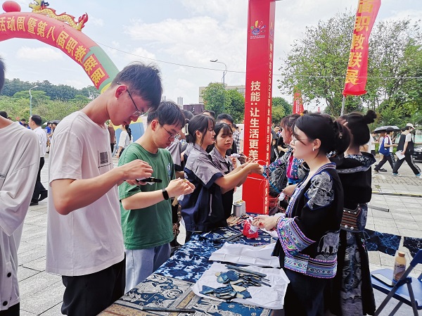 联展期间,柳州市广播电视台对我校展位进行了探展直播。在广西民间工艺大师、我校马践教授的蜡染作品前,艺术学院教师王霞向主持人介绍,我校坚持文化的传承与创新,充分发掘广西民族非遗文化资源,建成了区高校内规模最大的区级民族文化传承创新职业教育基地,牵头组织研制出广西苗族蜡染扎染非遗技艺鉴定标准;在不断探索非遗传承保护的过程中,形成了一系列丰硕成果。