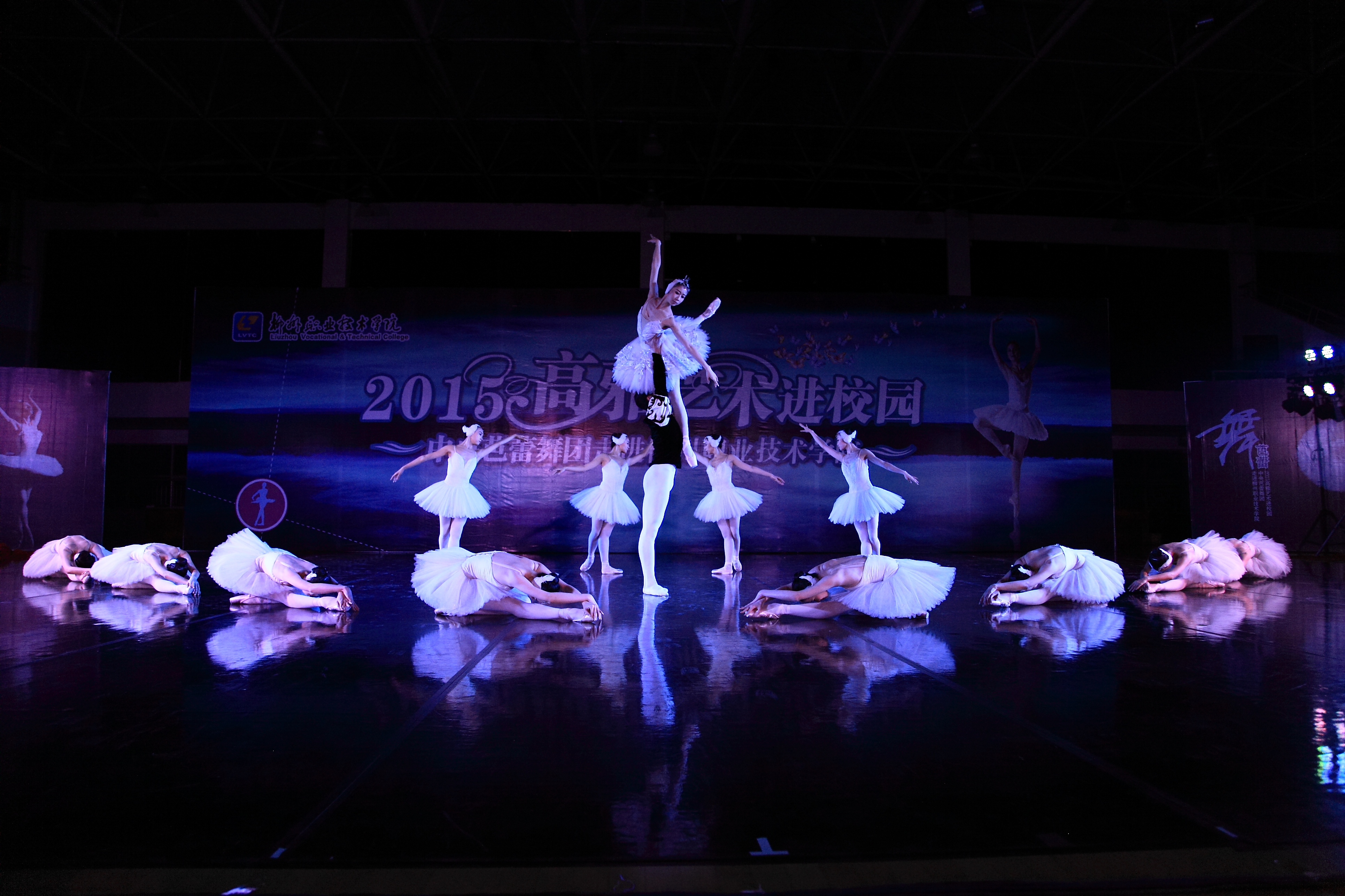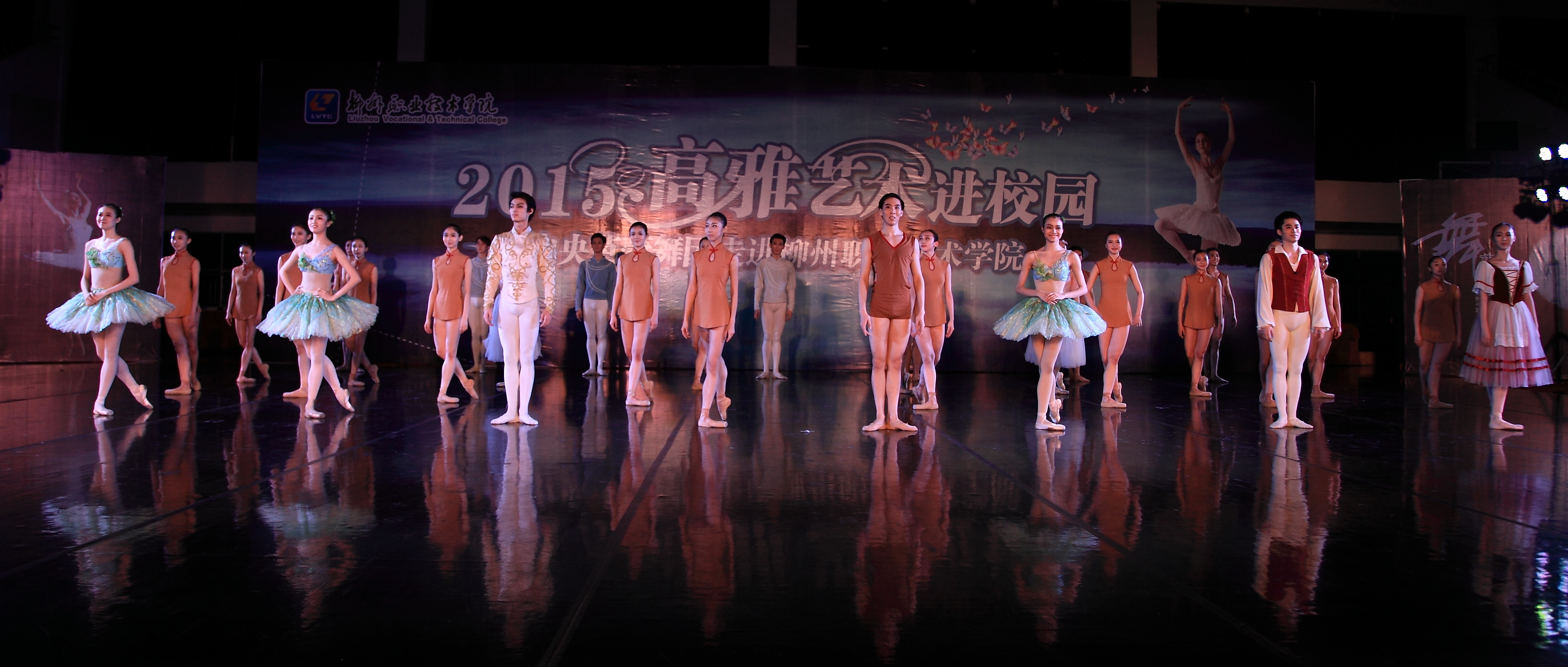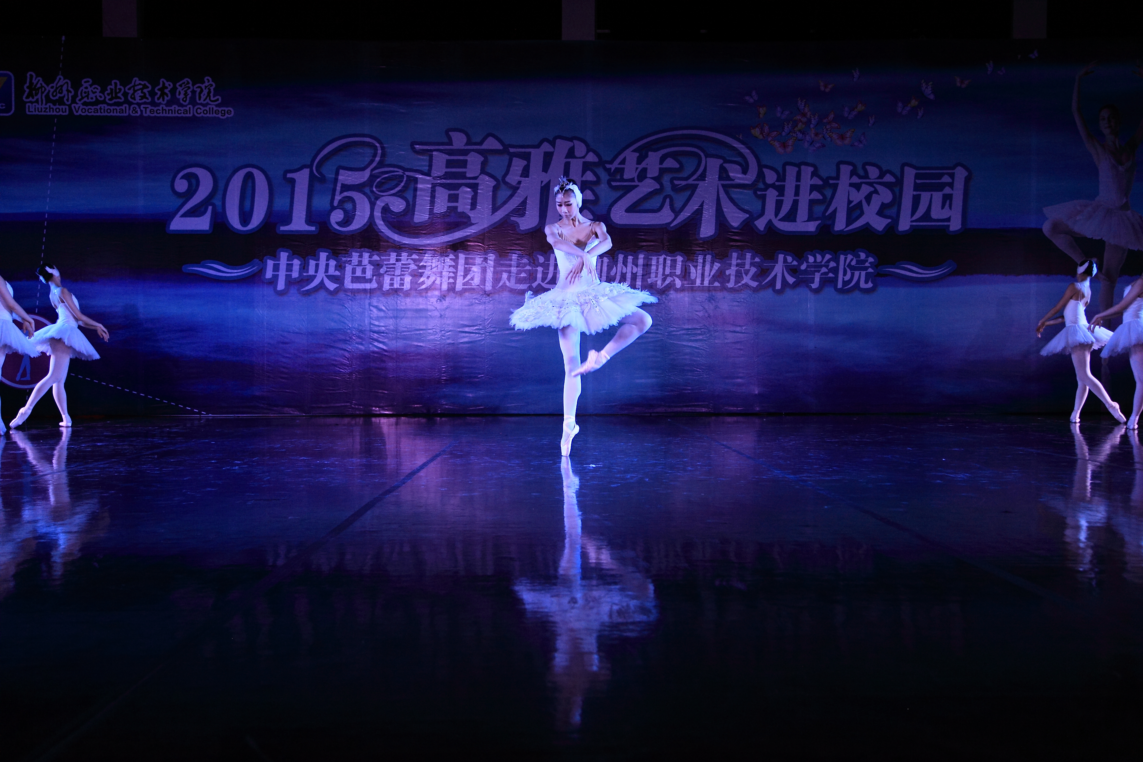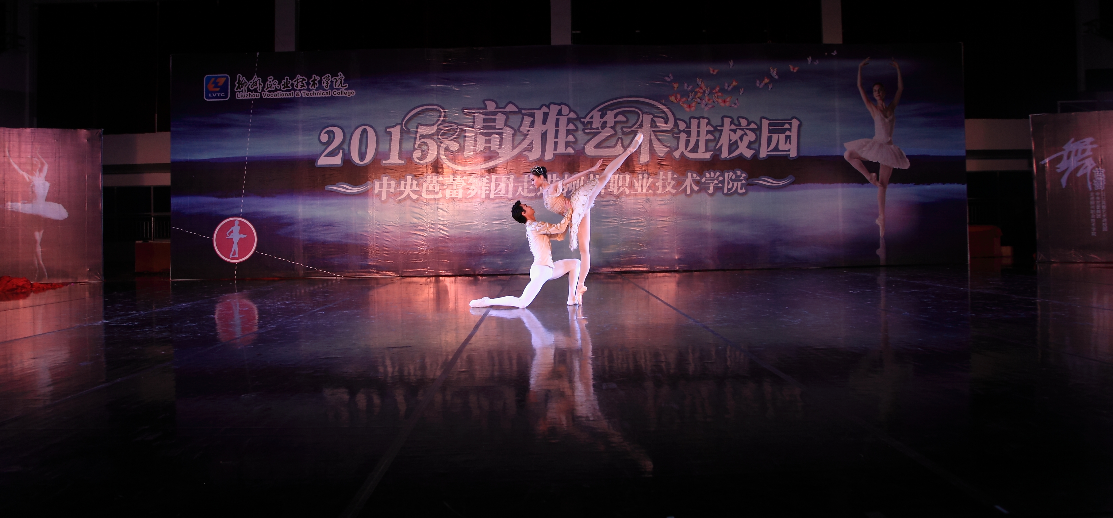 当晚4名少女简短的开场舞后,我院党委书记朱伟才讲话,欢迎远道而来的中央芭蕾舞团的演员们。该团是我国最高级别的艺术团体,多年来,致力于传承和传播高雅的艺术和文化,奠定了自身在行业中的地位。作为全国100所、广西仅2所的柳职院,在发展过程中,也以严谨的治学精神和办学理念在自己独树一帜的办学道路上执着追求,同样奠定了自己在全区乃至全国的地位。此次高雅艺术进校园活动,是艺术与教育的一次握手,将在我院校园文化史上留下深刻的印记,祝愿大家度过一个美好的夜晚!