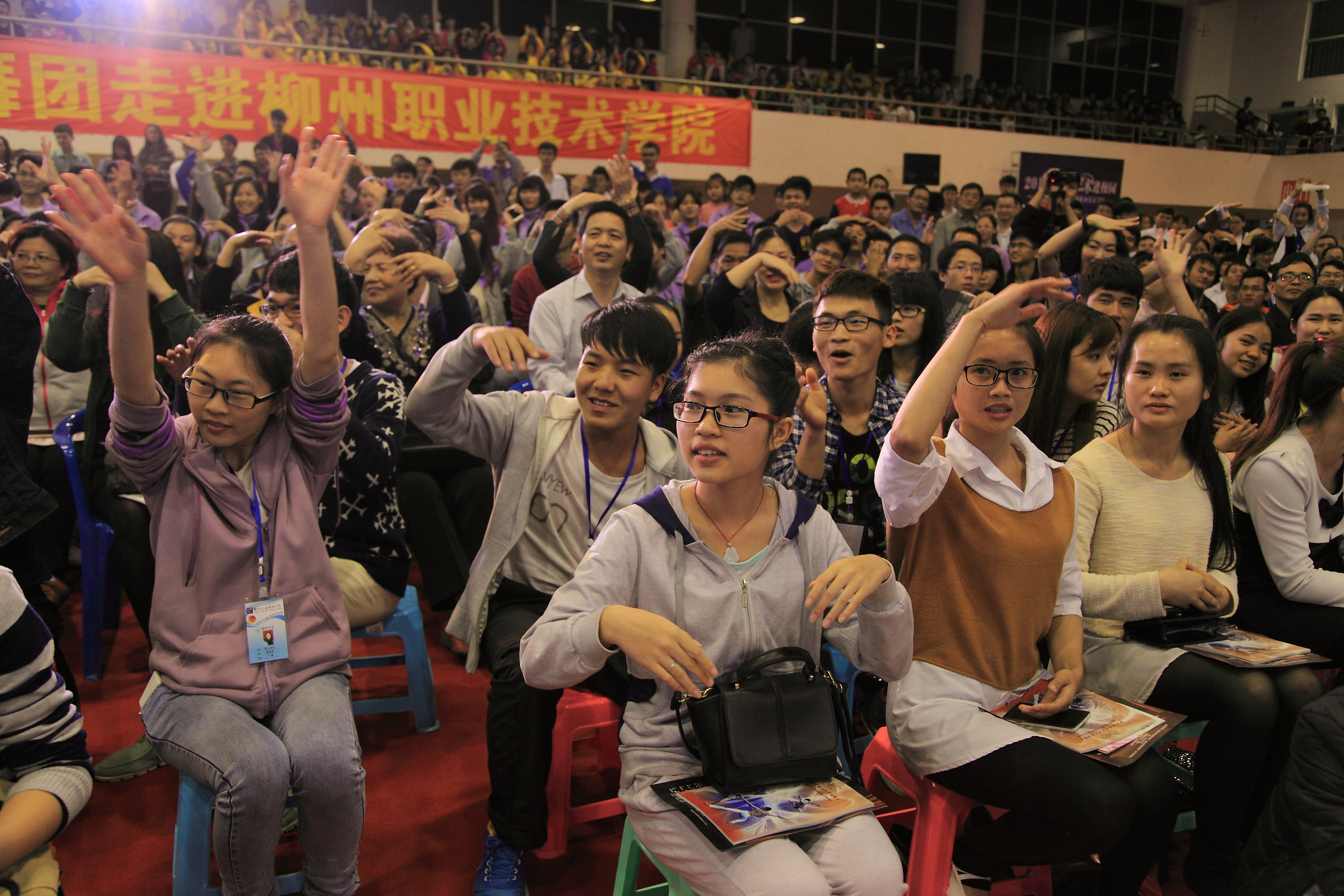晚会结束,观众们依依不舍,以调皮的方式留影。