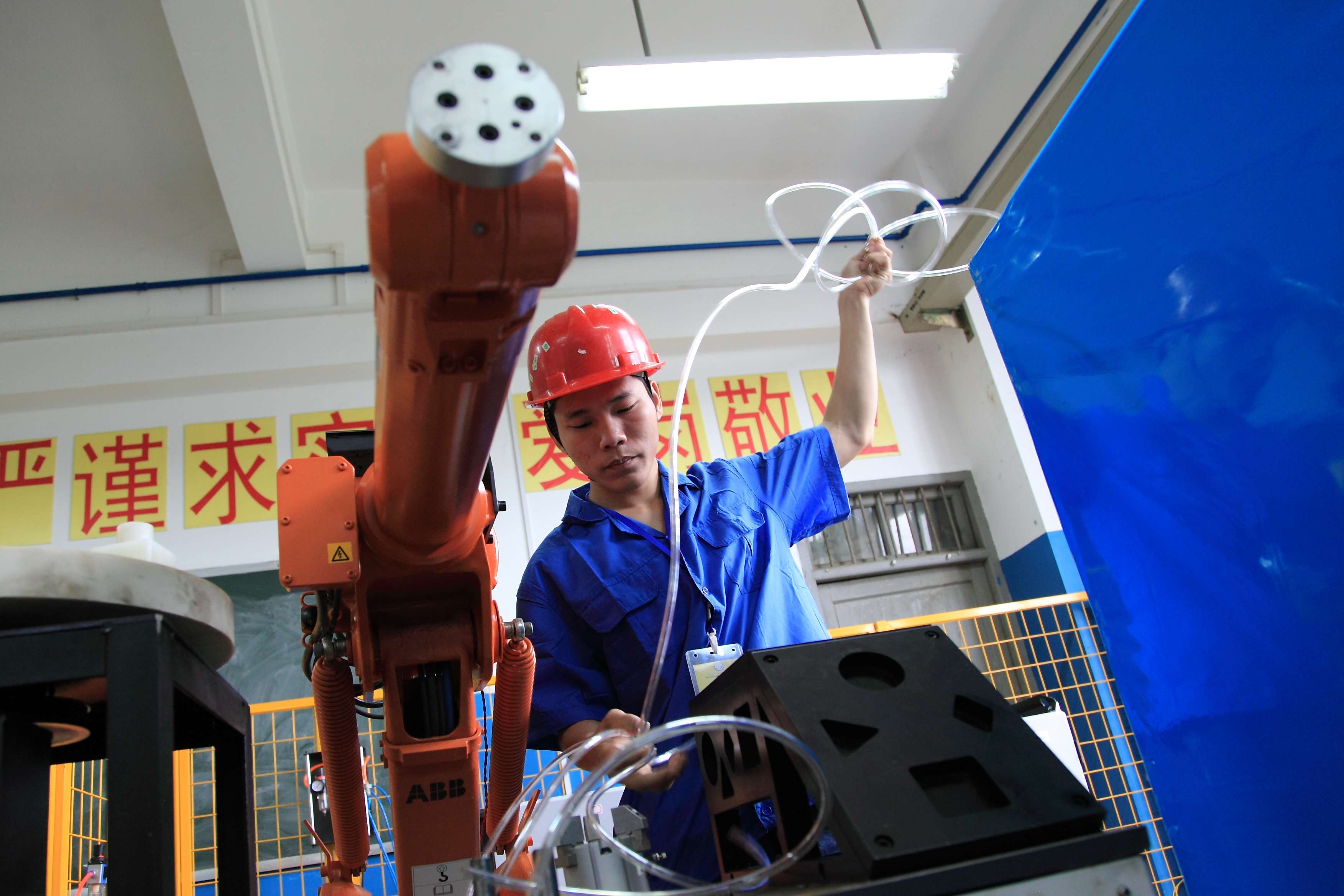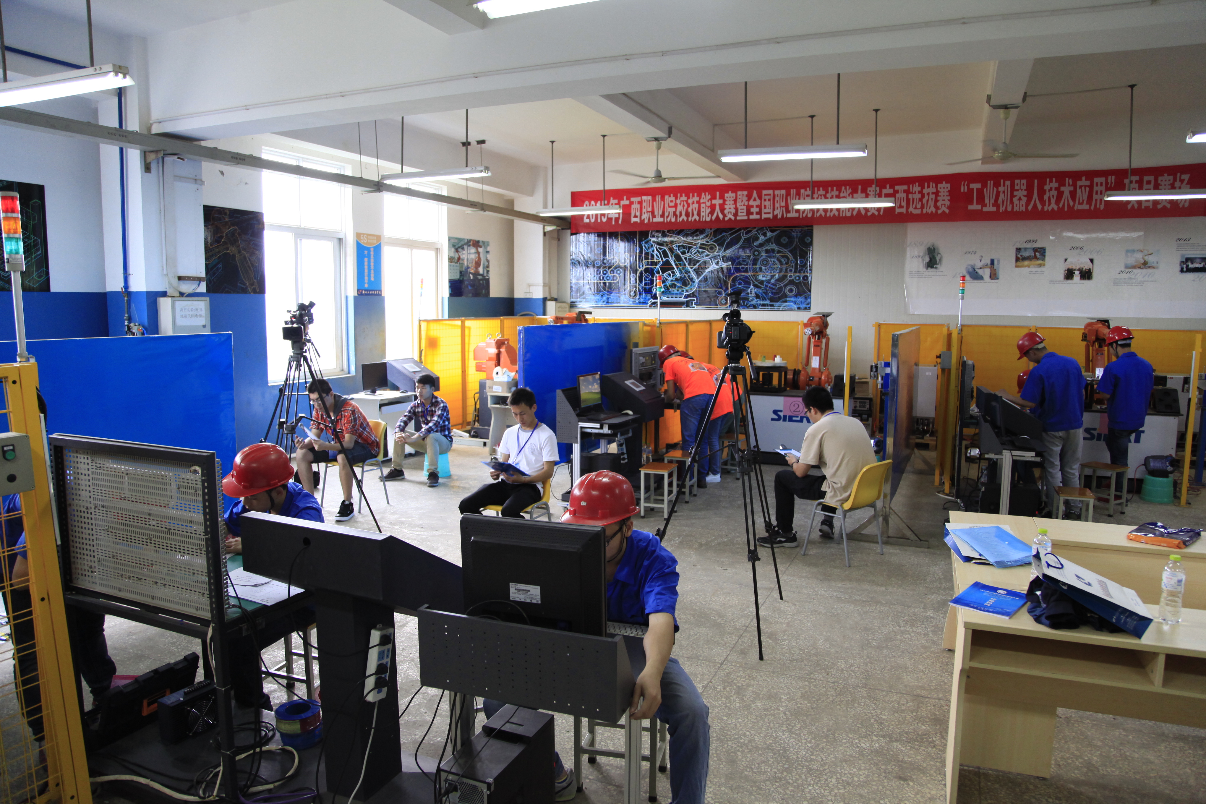新闻网消息(记者 崔智慧 摄影 朱敬民 李晓枫 李文昆)4月28日上午,在学院天工楼五楼工业机器人应用维修实训室里,4个橘黄色的“机械手”显得格外忙碌,它们不仅要帮助“主人”们抓取相应的工件,还要把工件安装到正确的位置上去。哇!《超能陆战队》里有温暖的大白,这四个“机械手”不就是柳职院能干的“大黄”吗?!----原来,这里就是2015年广西职业院校技能大赛工业机器人技术应用项目的比赛现场。据悉,此次我院共承办2015年广西职业院校技能大赛三个赛项,分别是4月28日开赛的工业产品造型设计与快速成型、工业机器人技术应用,以及4月29日开赛的三维建模数字化设计与制造。