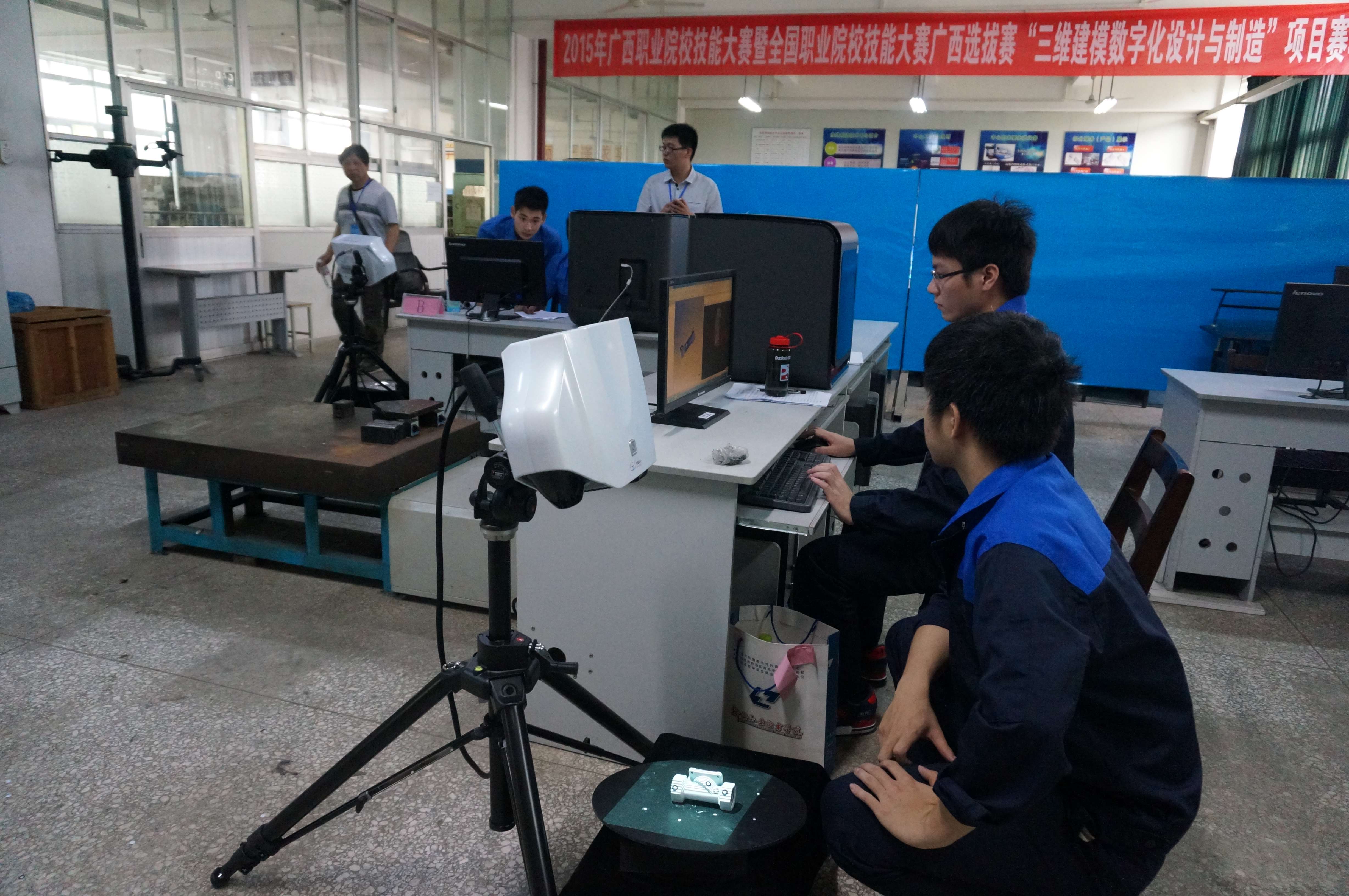 三维建模数字化设计与制造赛项在我院天工楼三楼的先进数字化设计与制造中心进行,这是我院承办的三个赛项中参赛院校最多的赛项,包括我院在内的来自8个高职院校的8支参赛队共16名队员在这里“真刀实枪”地大干一场。比赛分为数据采集与再设计、数控编程与加工两个部分,重点考察选手们的产品创新设计能力、数控编程及加工能力等,全部过程要求在6个小时之内完成,这也是一场“速度与激情”的较量!