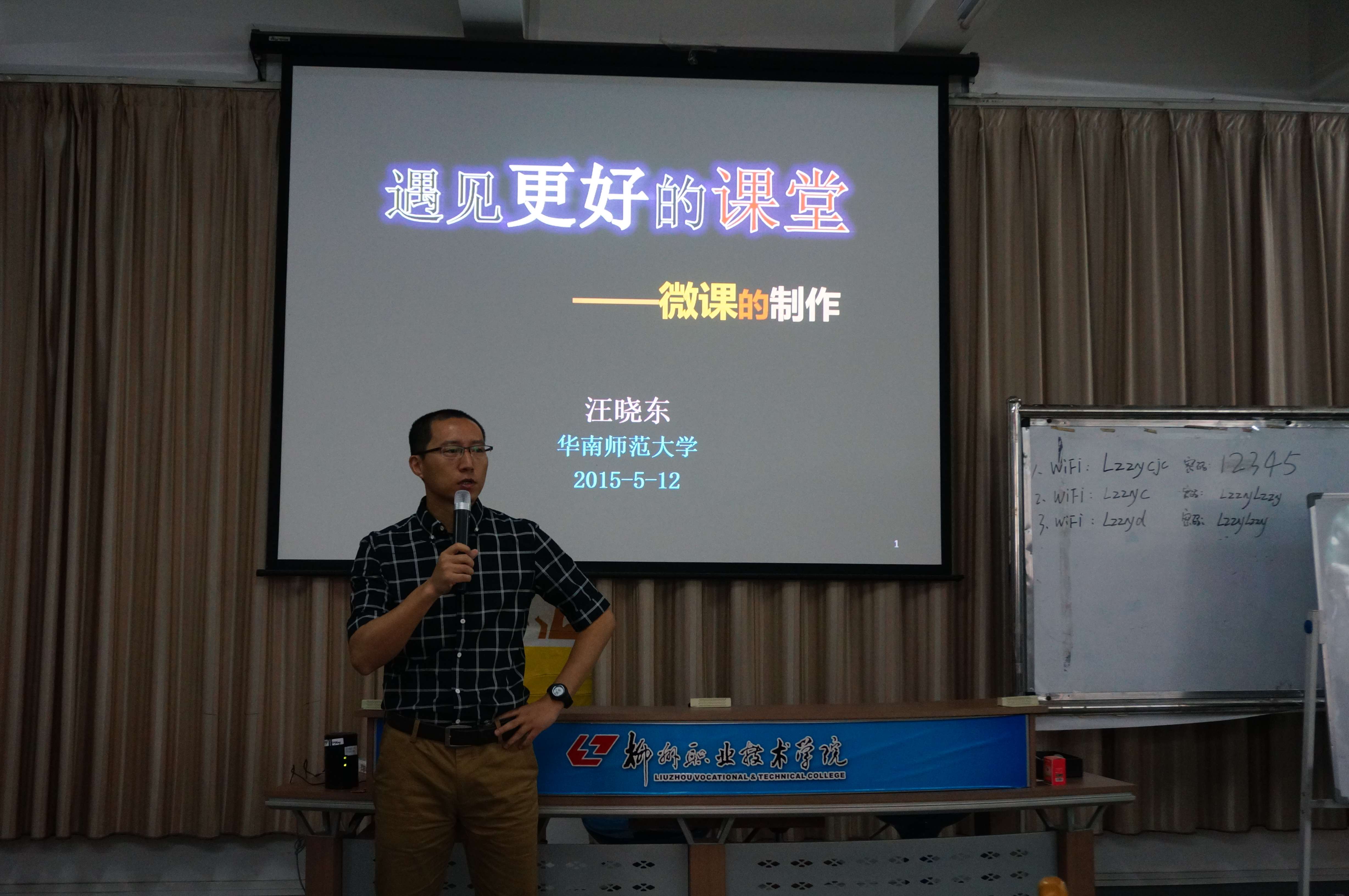 汪晓东老师是华南师范大学教育信息技术学院未来教育研究中心副教授、教育技术学博士、广东教育学会网络教育专业委员会副秘书长、教育部首届全国中小学教师微课大赛专家、教育部“全国教师信息技术培训”特约讲师。长期从事教育技术学基本理论和教师信息行为研究,与部分院校深度合作开发微课,指导实践翻转课堂,他自己本人也在教学中实施翻转教学,在微课制作、翻转课堂、教师教育技术培训上积累了丰富的实战经验,曾应邀在高校和中小学举办百余次讲座。他为我院教师带来第一次全院性的微课培训将是一个出发点,后期学院将进一步推进教师学习微课、制作微课,为深化我院教育教学改革,做好信息技术与教育教学深度融合,为推行翻转课堂奠定基础。