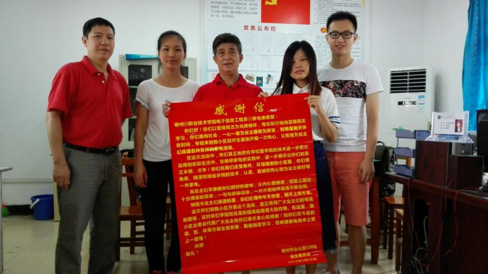 家电维修部自创办以来,走过了20年光景,一直坚持“一技之长,服务大众”的宗旨,每学期、每月都坚持到学院附近的居民小区开展义务维修活动。本学期自开学以来,该部门仅在3月就开展义务维修活动6次,同学们放弃了周末等休息时间,不辞辛苦,坚持外出实践,服务社会,这份精神值得我们肯定、鼓励和学习,同学们的努力付出得到了回报,也得到了来自社区居民的认可,这封感谢信就是对他们辛勤付出的最好回报!