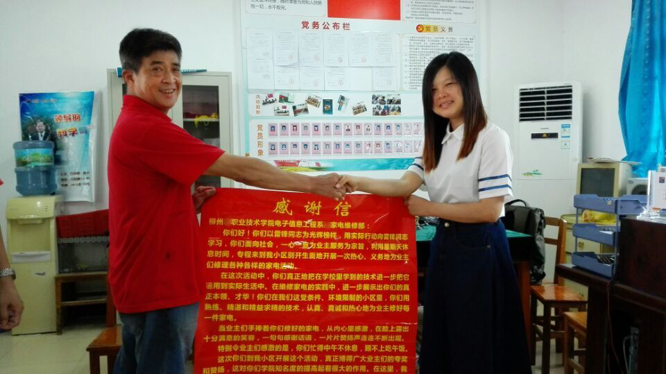 新闻网消息(通讯员/电信系 张晖宇 图/电信系 卢岚岚)5月28日上午,电子信息工程系迎来了一位特殊的客人——来自白云路126号小区业主委员会的周队长。周队长为电子信息工程系家电维修部送来了一封感谢信,以此表达对家电维修部为他们小区居民所做的义务维修服务的感谢。这封感谢信语言朴实,情感真挚,字里行间无不表达了对同学们的感激之情。电子信息工程系党总支副书记黎晓灵、分团委书记张晖宇、家电维修部副部长黄秋燕和维修部干事张燕燕同学在该系辅导员104办公室热情接待了周队长。