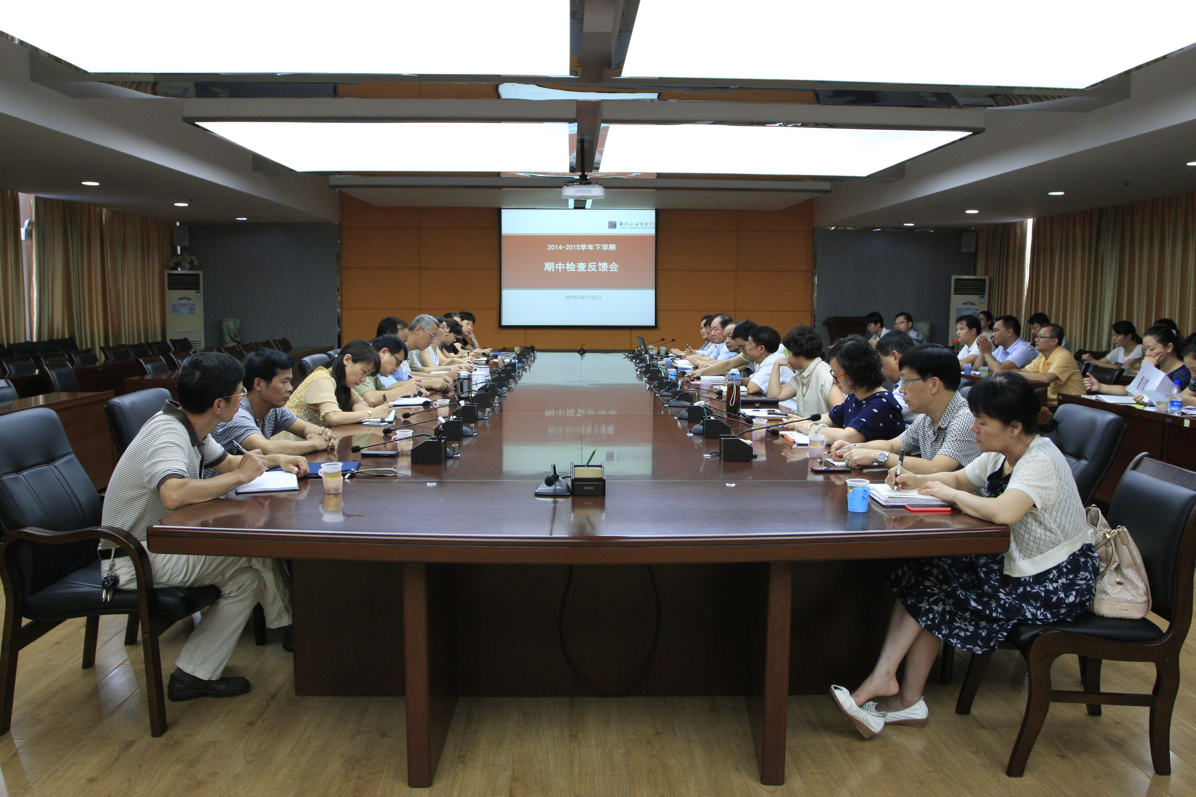 新闻网消息(通讯员/教务处 林宁 图/教务处 刘晶)6月12日,在行政楼300会议室,教务与实训管理处和学生工作处联合召开了期中检查反馈会暨本学期第四次教学工作例会。院长石令明,副院长杨毅、林若森,督导室主任傅昌德,各系部书记、正、副主任、教学秘书、学生科长,教务与实训管理处全体人员、学生工作处全体人员参加会议。会议由教务与实训管理处处长韦林主持。