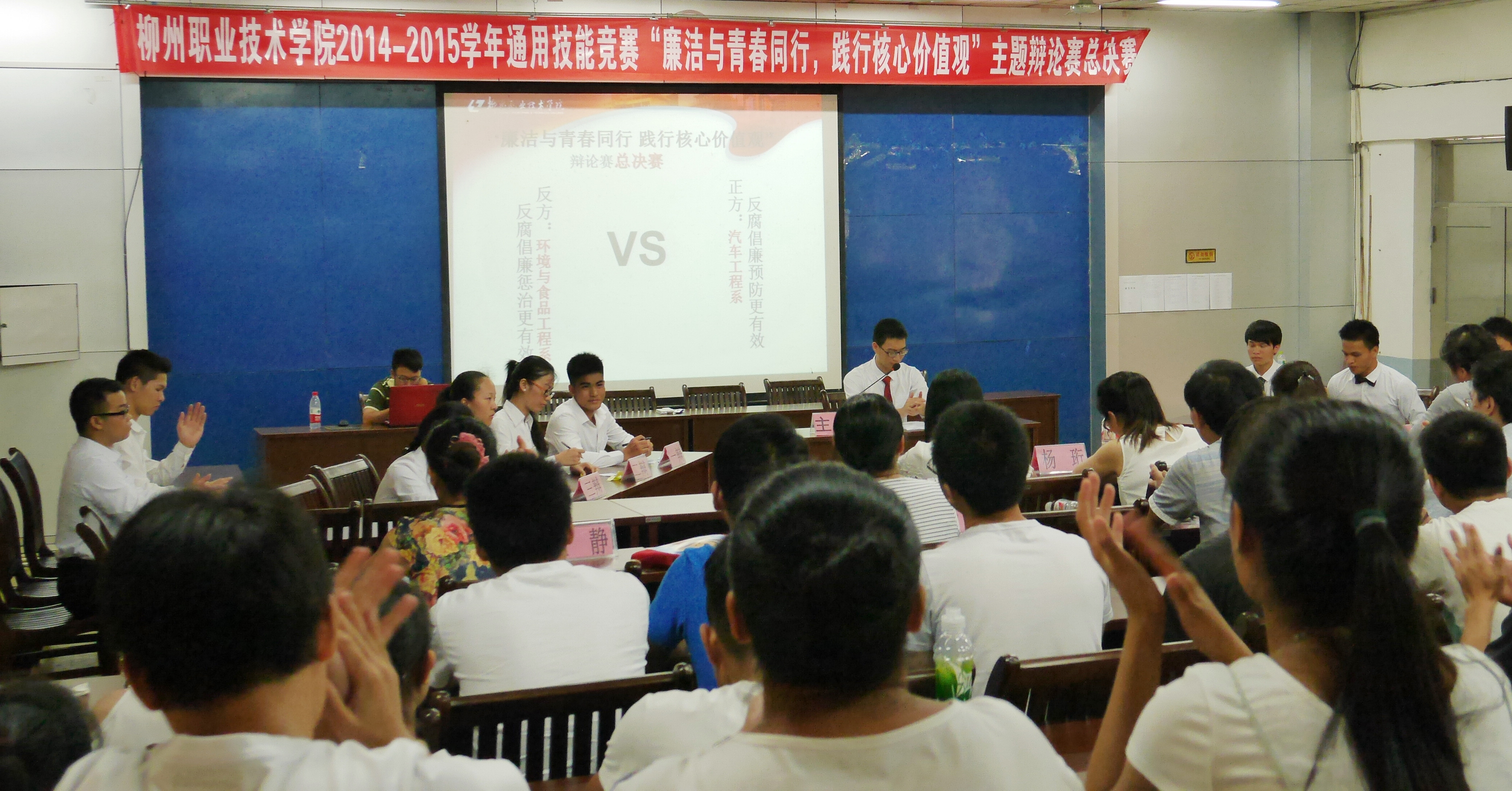 新闻网消息(通讯员/公共基础部 韦柳钰 摄影/宣传部 朱敬民、季长贤、赵汝兰)6月25日下午,思贤楼101教室上演了一场不见硝烟的战争。对战双方唇枪舌剑,针锋相对,战得是难分难解,不亦乐乎。这正是2014-2015年度大学生通用技能竞赛“廉洁与青春同行,践行核心价值观”主题辩论赛的决赛现场。全院130余名师生见证了这场精彩的巅峰对决。此次观赛嘉宾阵容强大,学院党委副书记阳旭、副院长杨毅、督导处处长傅昌德、学生工作处处长唐冬雷、院团委书记王慧以及各系的书记到场观战,显示了学院及各系部领导对此次辩论赛的重视。