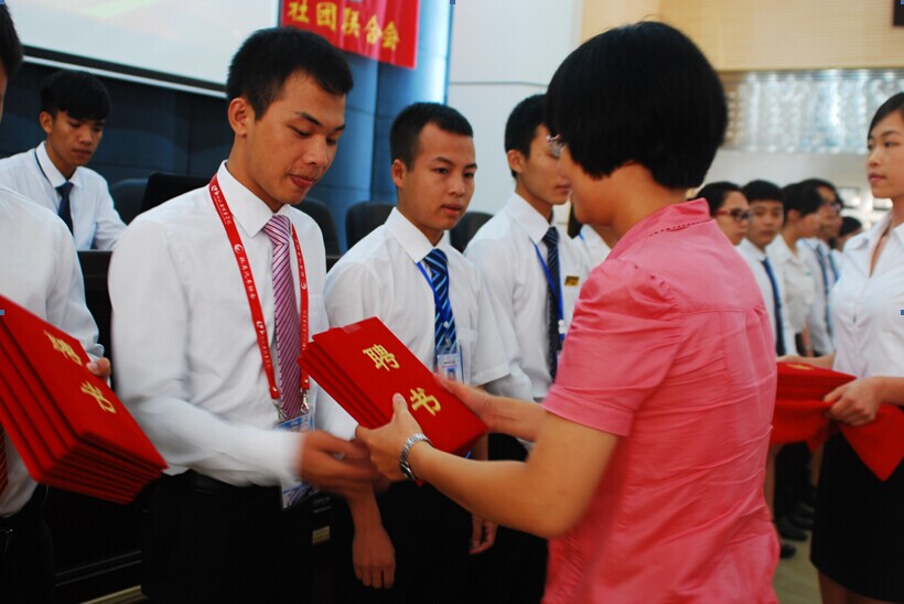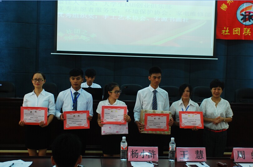 伴随着一年的社团工作结束,又一批优秀的社团干部成长起来了。表彰大会上,院团委王慧书记、周虹老师分别为我院30个社团会长团颁发聘书,以此鼓励并感谢社团干部们这一年来的付出与努力。为了充分发挥社团模范作用,此次表彰大会还分别授予了大学生KAB创业俱乐部为“学年度社团工作最佳人气奖”,授予环境保护协会、家电维修部为“学院优秀社团志愿服务奖”,手工艺术协会、宏源书画社被评为“社团工作优秀组织奖”,商务实战协会、物流协会被评为“年度社团工作团队建设奖”,月亮山读书文学社、ST轮滑社被评为“年度社团工作创新奖”。院团委王慧书记、周虹老师分别为他们颁发了奖状及奖品。