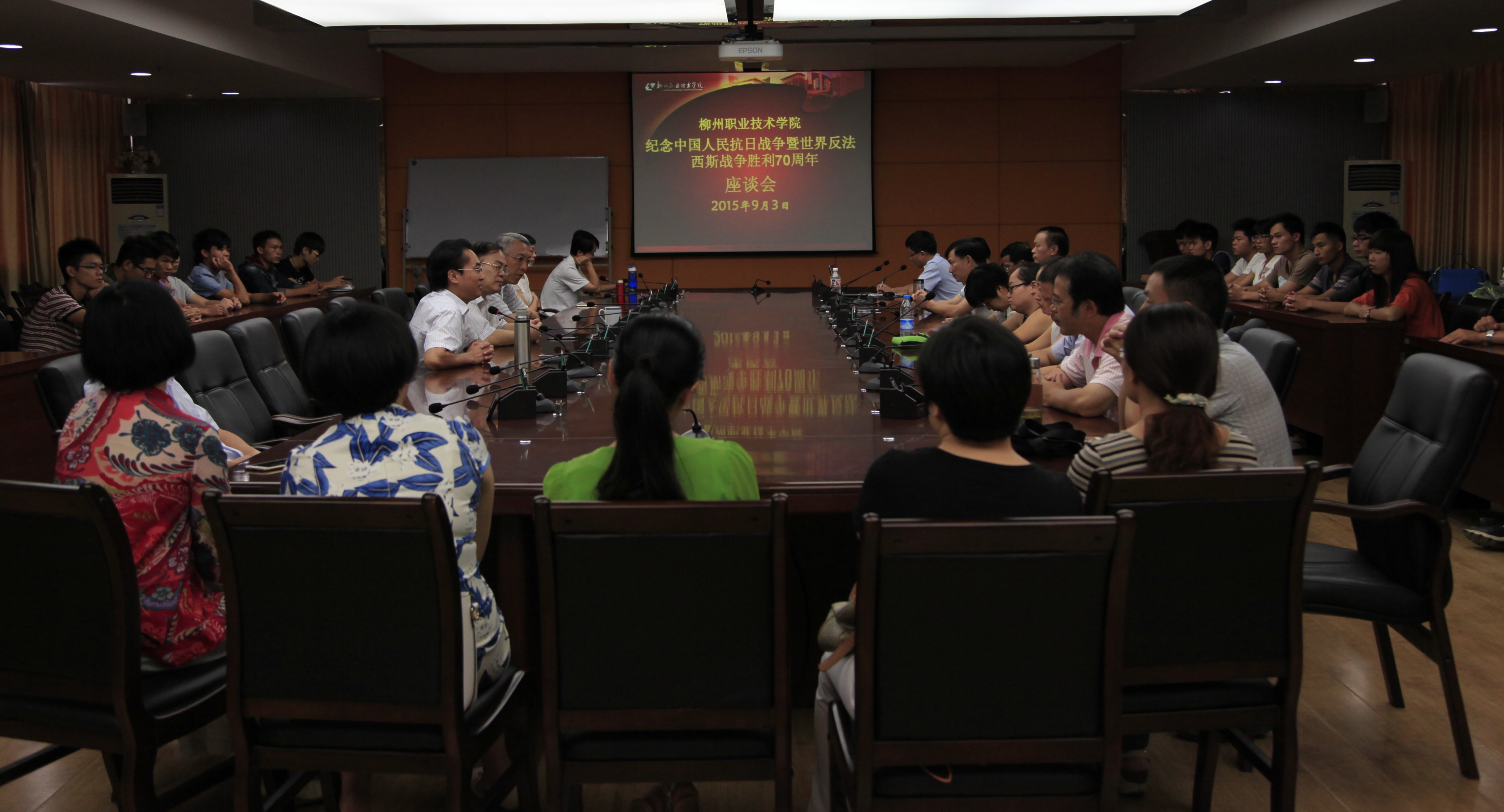 新闻网消息(记者 崔智慧 摄影 朱敬民)今年是中国人民抗日战争暨世界反法西斯战争胜利70周年。为深切缅怀抗战英烈的光辉业绩,弘扬抗战精神、爱国主义精神和民族精神,深入推进社会主义核心价值观建设,学院于9月3日上午组织师生代表60余人在300会议室集中收看纪念中国人民抗日战争暨世界反法西斯战争胜利70周年大会,并召开座谈会。学院领导朱伟才、阳旭、杨毅,各部门、系部主要负责人,思想政治理论课教学团队负责人,及各系学生代表等怀着无比庄严和激动的心情集中收看了大会直播。