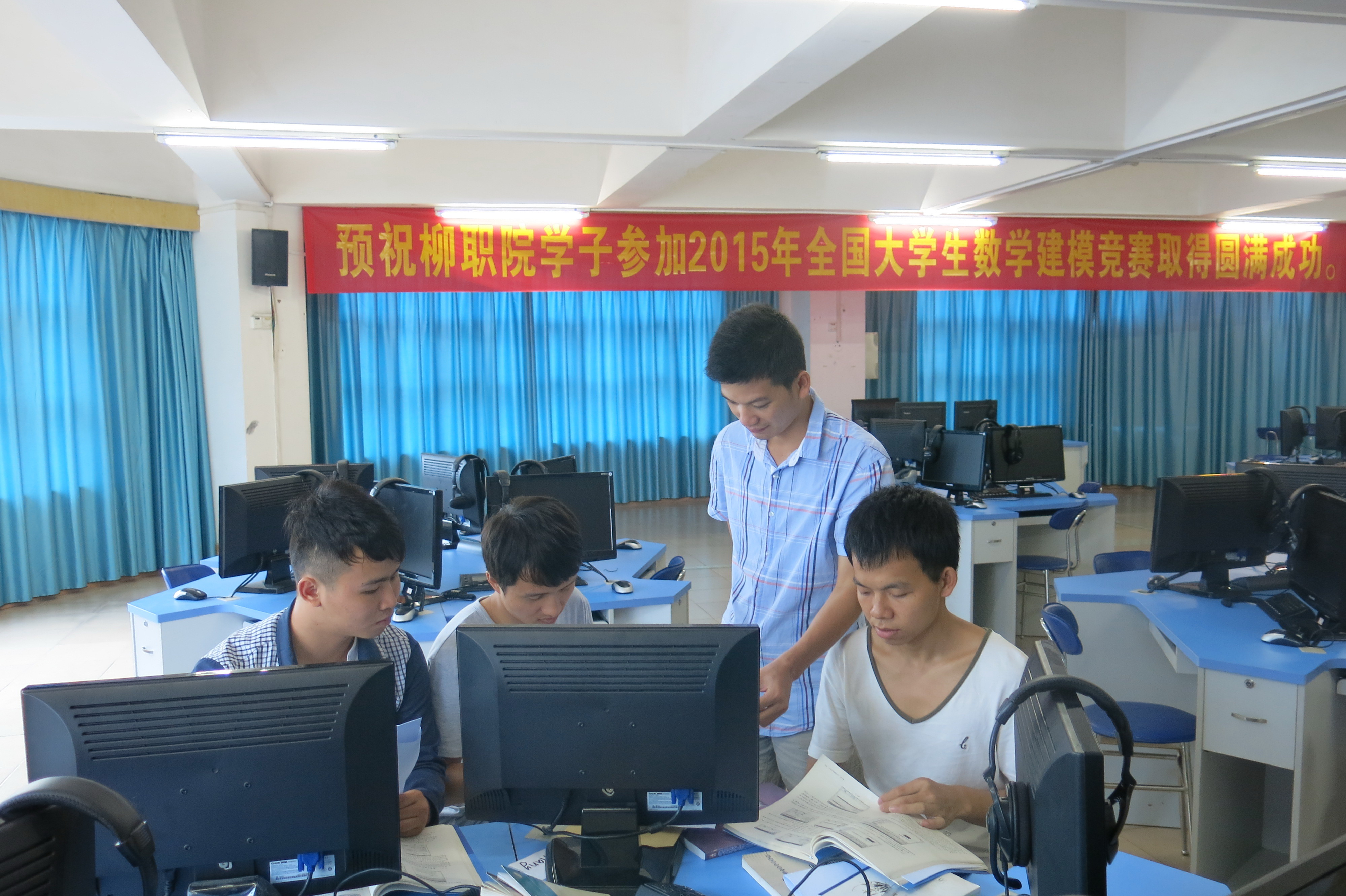 赛前,为能够使2015年“高教社杯”全国大学生数学建模竞赛在我院分赛场顺利进行,公共基础部主任姜献生、副主任陈芳、李革到赛场巡视并慰问了卢家林、李大林、黄艳华、韦碧鹏4位指导教师以及参赛队员,鼓励队员们要发扬不怕苦、不怕累的精神,团结一心、奋力拼搏,创新思维、赛出水平,取得骄人成绩,为学院争得荣誉。现代教育中心为比赛顺利进行提供了技术和设备支持,覃纪武主任还到现场检视了比赛所需要的电子设备、网络等是否准备就绪。