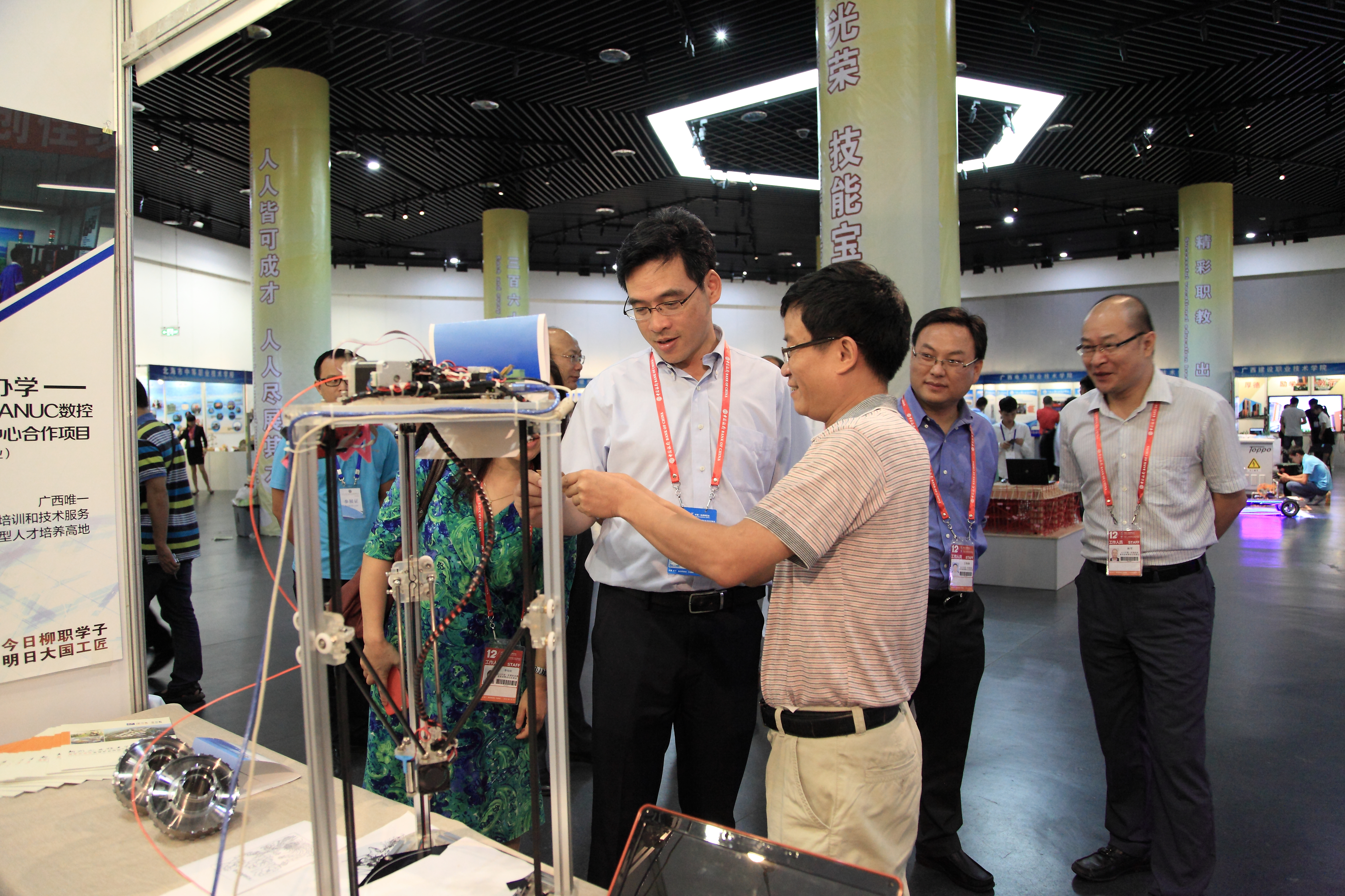 展会上,我院展示了激光雕刻与快速成型机、自动变速箱活塞支架、《交响演绎》服装系列等经过精挑细选的优秀作品,充分展示了我院学生精湛的手工技能和创新能力。教育部副部长鲁昕、教育厅厅长秦斌等领导先后在学院展位前了解我院学生技能作品,对作品给予了充分的肯定。鲁副部长说:“希望继续搞这些创新发明,采用先进技术服务社会发展。”而我院的“激光雕刻与快速成型机”作品成为整个展厅最大的亮点之一。电子信息工程系学生张晋华现场为企业人员、外国友人、教师、学生等参观人员共打印并赠送近30张竹木名片、打印并赠送近20副绘画作品。