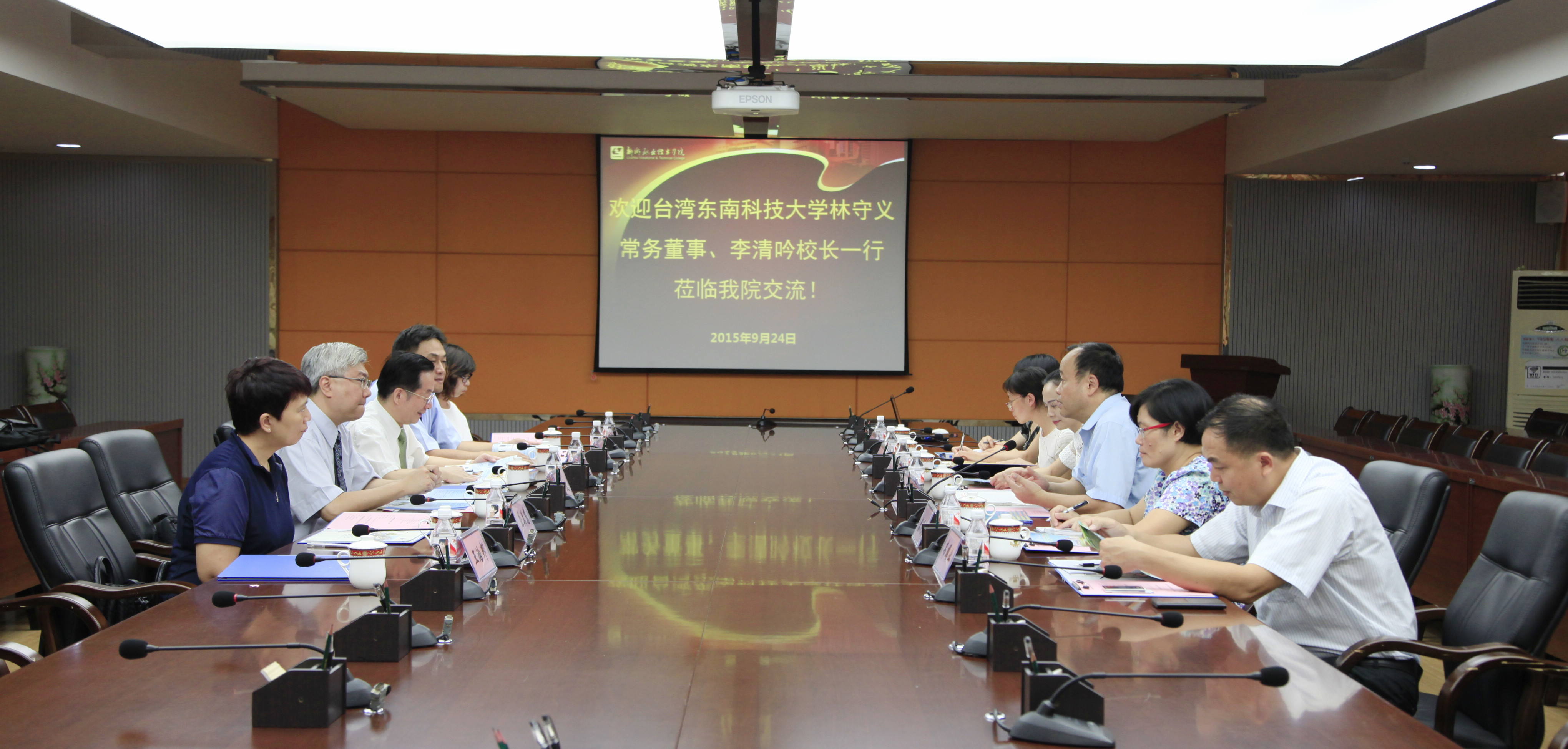 新闻网消息(通讯员/院办 赵萃 摄影/朱敬民、陈明鑫)9月24日上午,台湾东南科技大学常务董事林守义、校长李清吟、董事龚美慧等一行六人到我院交流访问,自治区教育厅教师培训中心国际交流项目办主任唐燕艳陪同。学院院长石令明,人事处处长黎凤环、教务与实训管理处处长韦林等参加了会谈。