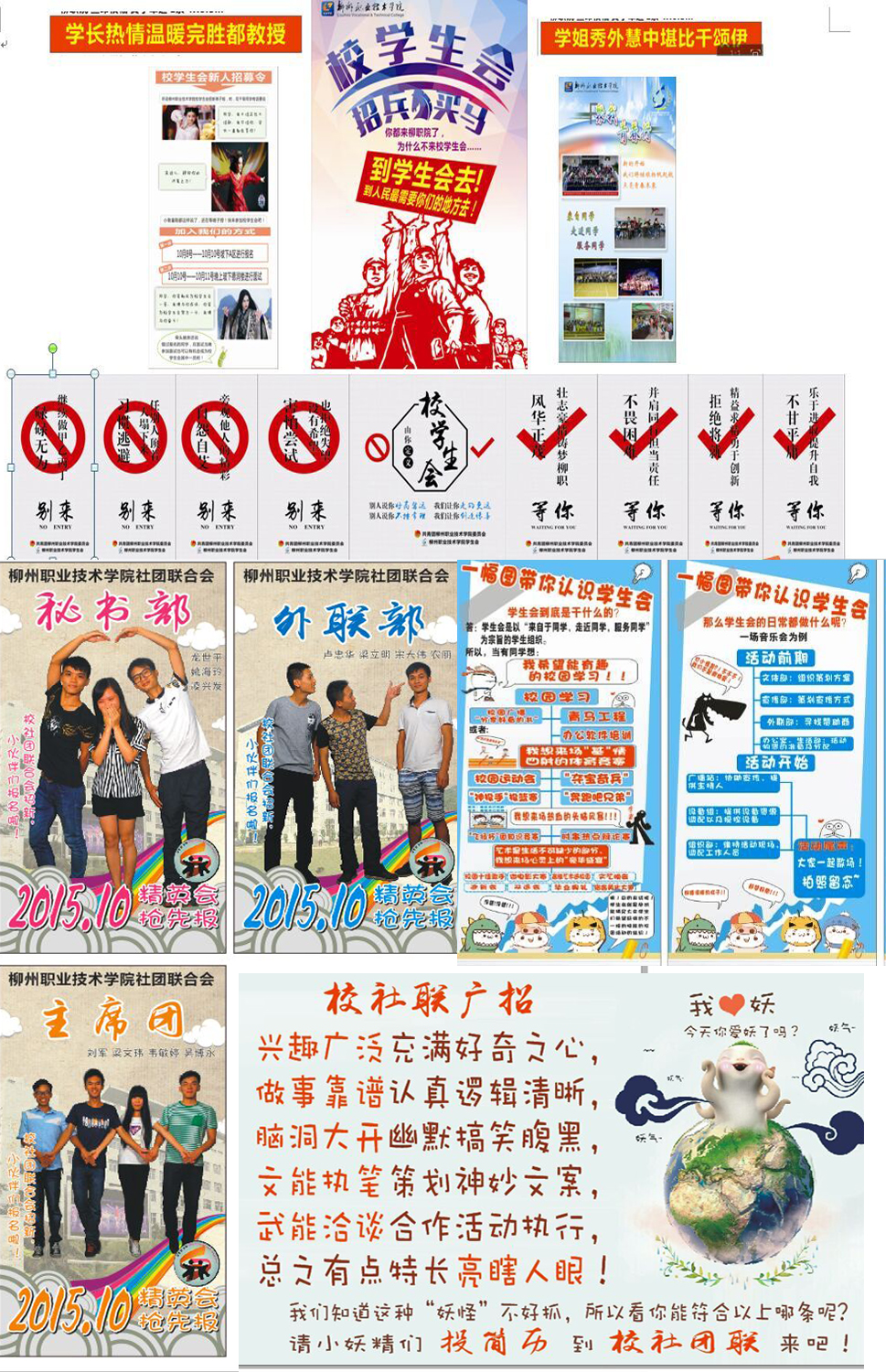 此次全校各系学生会、各社团组织的报名、面试工作亮点多多。在校级团体招新现场,宣传制品上今年主打推出了一批荧屏时尚热点元素,如采用《花千骨》、《捉妖记》等热点影视作品的旁白设计招新宣传口号,以更直观、更活泼的方式,吸引新生们轻松感受到该组织的风格和特色,以便快速形成自己的选择。此外,提前宣传也为招新工作顺利开展做足了铺垫,在9月底举行的社团招新海报展就打响了纳新大战的第一枪,另外,校团委联合学院电视台、微时空、微博社等团队打造的线上线下各媒介宣传也是全方位覆盖,如在LED电子显示屏播放的社团影集、广播站招新广播、柳职青春社区的论坛大讨论、校园微时空的招新微信专辑栏目等各类宣传媒介广泛利用多媒体技术,为此次招新工作做足了宣传。