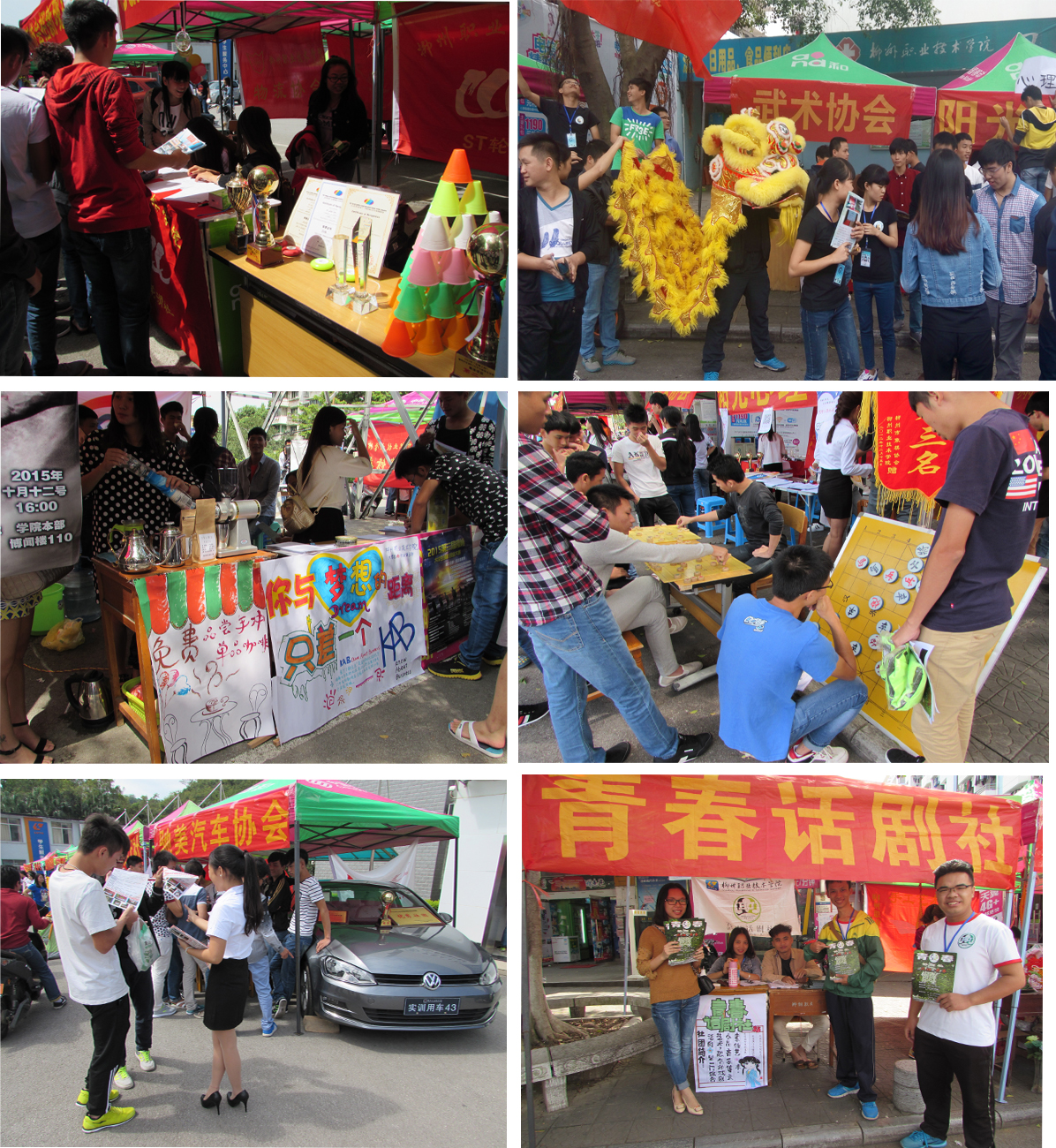 真人体验、师生参与、技能实力大比拼也是今年的一大亮点。招新虽然是分批进行,但展示时间延长也为宣传提供了充足的保障,在各学生团体的招新现场,各团体拿出看家本领,各展奇招,使出浑身解数“招兵买马,各社团独具匠心的海报、板报、传单以及硕果累累的奖品展示台,纷纷向新生们展示自己雄厚的实力,很多宣传使用的材料以及现场摆放的道具都是学长学姐亲手制作,驰美汽车协会更是将挂靠单位的实训用车开到了招新摊点;武术协会的一对舞狮也到场助威;大学生KAB创业俱乐部搬来了自己的创业实践产品,现场品尝现磨咖啡……