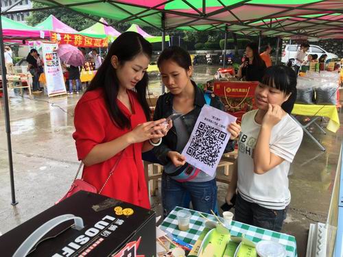 学生在指导市民朋友扫描二维码,关注微商城