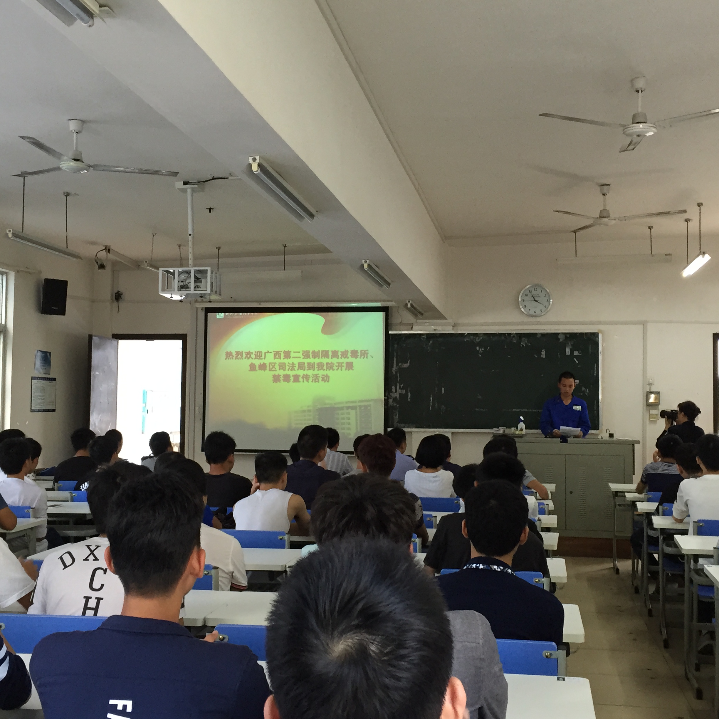 新闻网消息(通讯员 学工处/胡慕贤)为使广大学子认识到毒品对个人、社会的危害,11月6日15:30,我院邀请广西第二强制隔离戒毒所相关人员在博闻楼411教室为同学们做禁毒知识讲座。柳州市鱼峰区司法局副局长黄辉、麒麟街道办事处主任郭良敏、西江社区居委会书记曾晓丹、主任周友云等13人以及来自我院系部110余名学子来到讲座现场,共同学习禁毒知识。